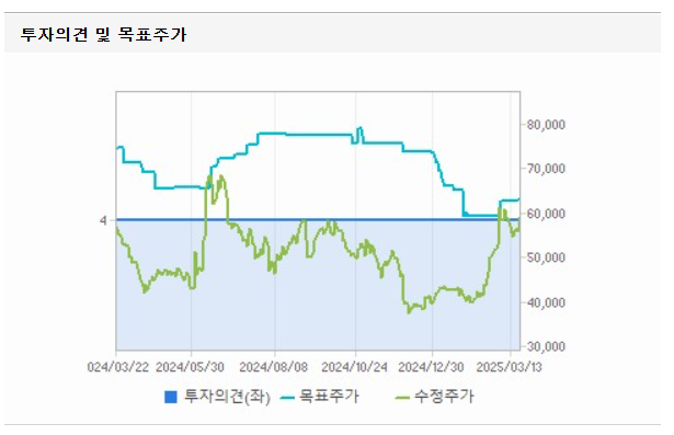 하나증권은 목표주가를 기존 대비 13.2% 하향 조정한 6만6000원으로 설정했지만, 투자의견은 여전히 ‘매수’를 유지했습니다. PER 16배를 기준으로 2025년 예상 EPS를 반영한 결과입니다.