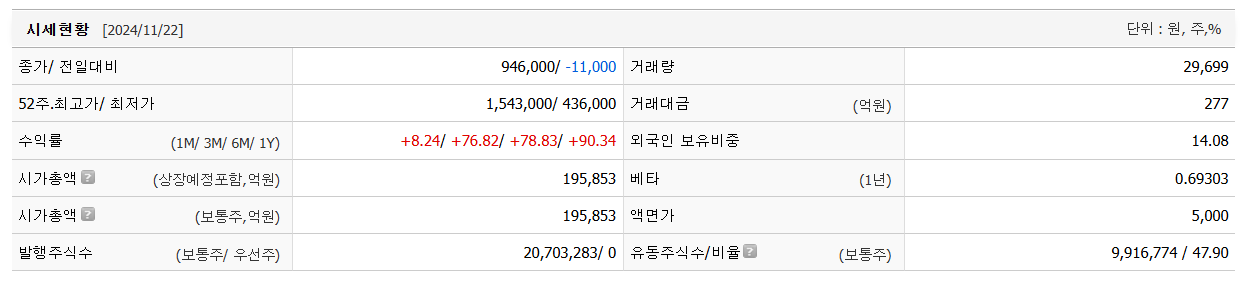 고려아연의 현재 주가는 946,000원입니다. 전일 대비 -11,000원 이동한 모습입니다. 시가 총액은 18조6951억 원이며 발행 주식은 총 20,703,283주 입니다. 외국인이 보유한 비중은 14.08%입니다. 고려아연 기업의 영업이익은 억 원을 달성했으며 배당 수익율은 3.01% 입니다.