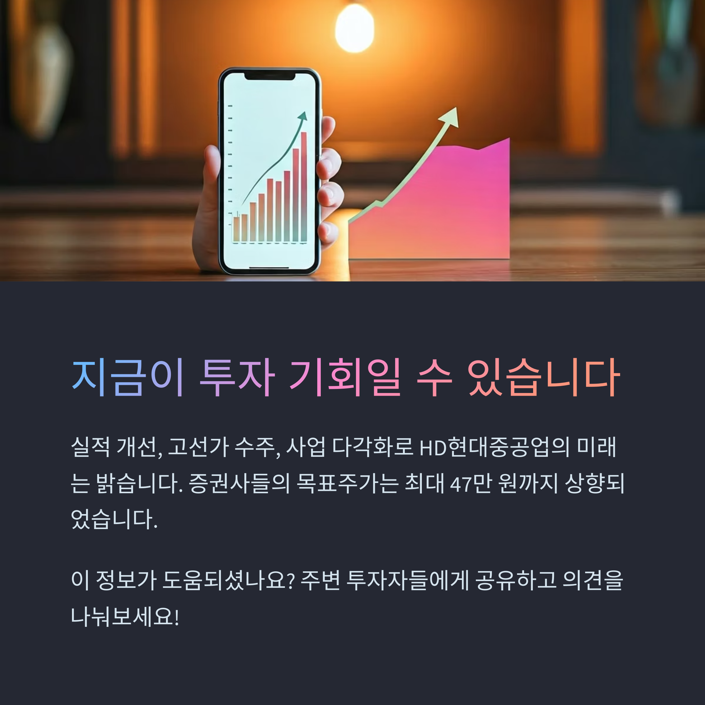 HD현대중공업 주가 전망은 실적 개선, 고선가 수주, 미국 방산 수혜 가능성 등 다각적인 측면에서 매우 긍정적입니다. 이미 조선업계를 선도하고 있는 기업이지만, 엔진과 방산, 해양플랜트 등으로 사업을 다각화하고 있는 점은 향후 주가에도 긍정적인 영향을 줄 수 있습니다.