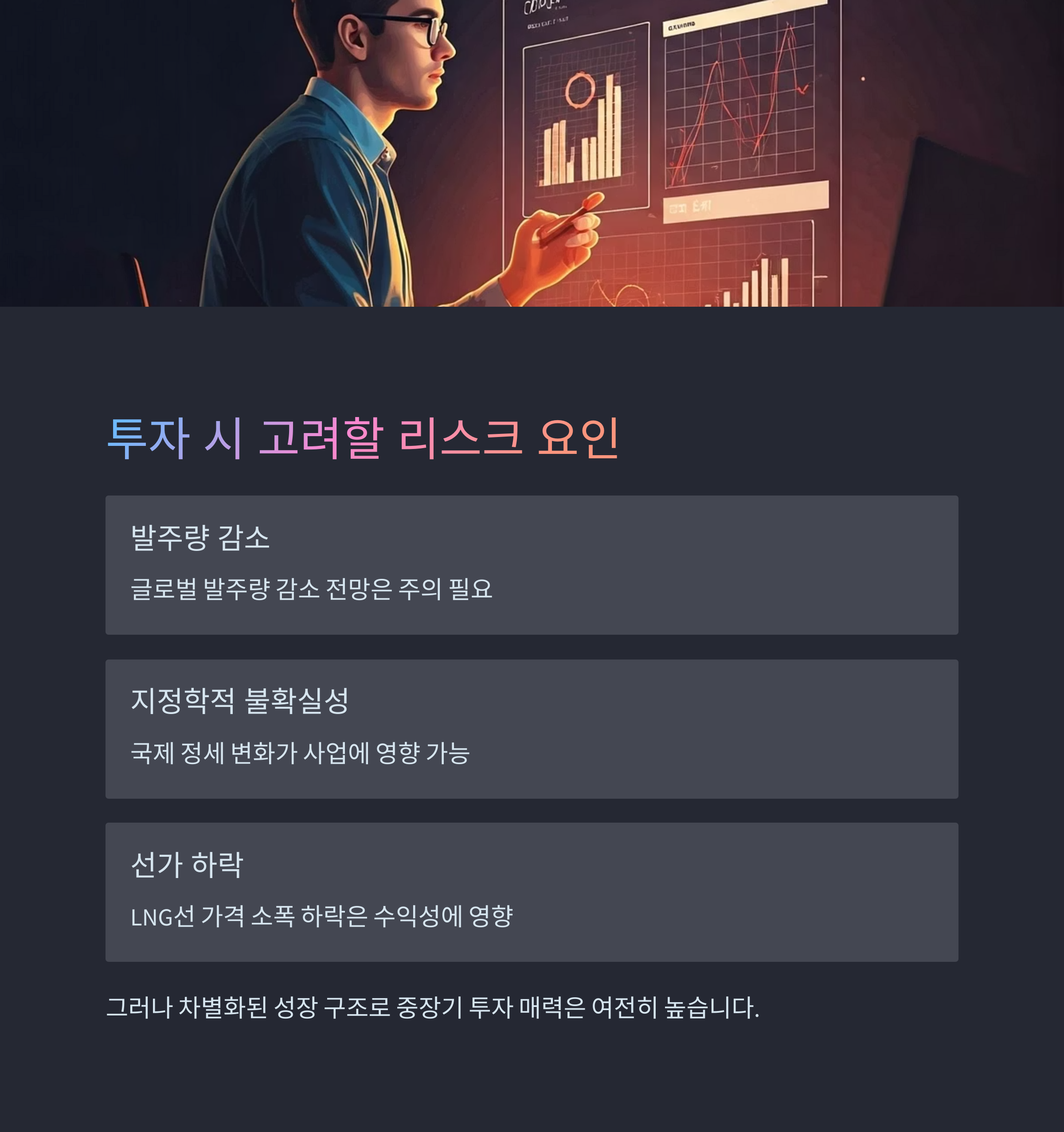 현재 HD현대중공업은 실적과 수주, 정책 수혜 등 여러 요인이 결합되며 ‘황금기’를 맞이한 모습입니다. 하지만 모든 투자에 리스크는 존재합니다. 글로벌 발주량 감소 전망, 지정학적 불확실성, 선가 하락 등의 변수는 투자 시 고려해야 할 요소입니다. 특히 LNG선 가격이 소폭 하락세를 보이는 점은 단기적으로 수익성에 영향을 줄 수 있습니다.