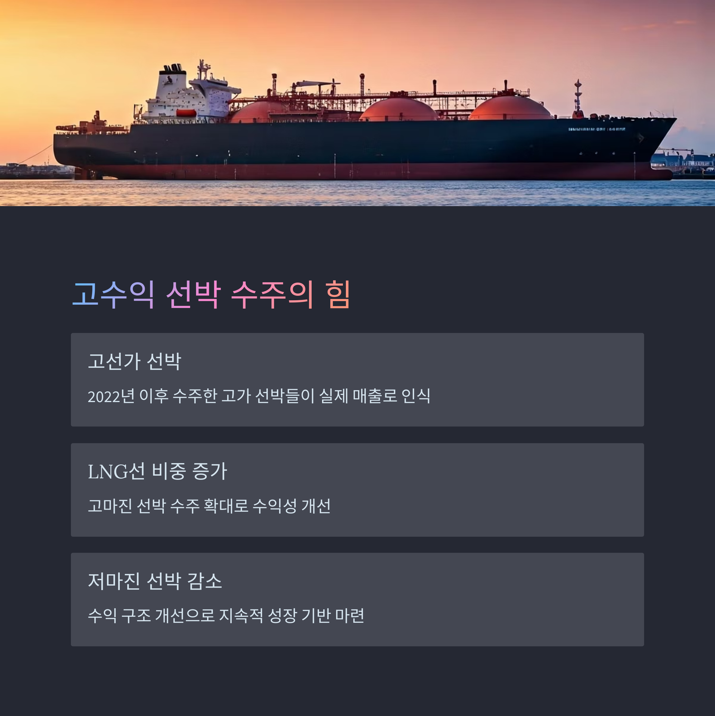 2025년 연간 기준으로도 매출 16조 원, 영업이익 1조 1천억 원 수준이 예상되고 있어, 실적 개선은 단기적인 반짝 효과가 아닌 지속적인 흐름으로 이어질 가능성이 높습니다. 저마진 선박 비중 감소, LNG선과 같은 고가 선박의 수주 비중 증가 등이 그 배경입니다.