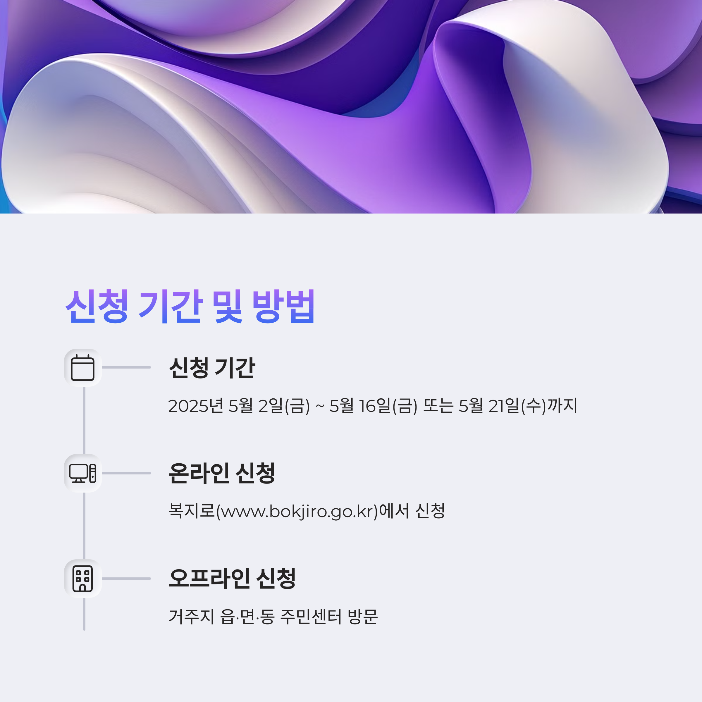 2025년 신청 일정은 복지로 공식 홈페이지 및 주민센터를 통해 공지되며, 온라인 신청은 복지로 사이트에서 진행됩니다.
