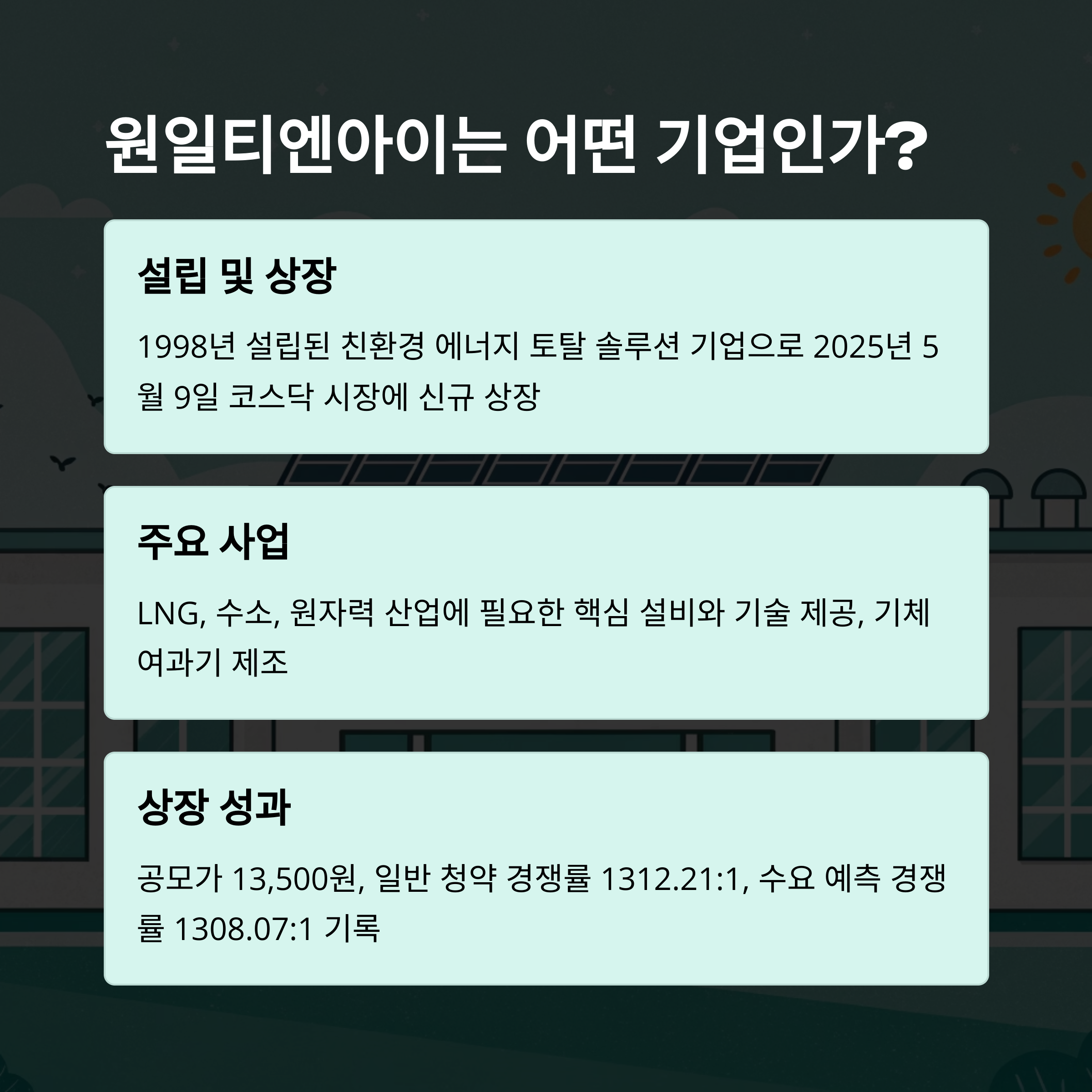2025년 5월 9일 코스닥 시장에 신규 상장한 원일티엔아이는 상장 첫날 공모가 대비 80% 이상 상승하며 주식시장에서 큰 관심을 받고 있습니다. 이 글에서는 원일티엔아이의 기업 개요, 사업 영역, 재무 현황, 산업 전망, 주가 동향, 성장 전략 등을 다각도로 분석해 주가 전망을 살펴보겠습니다.