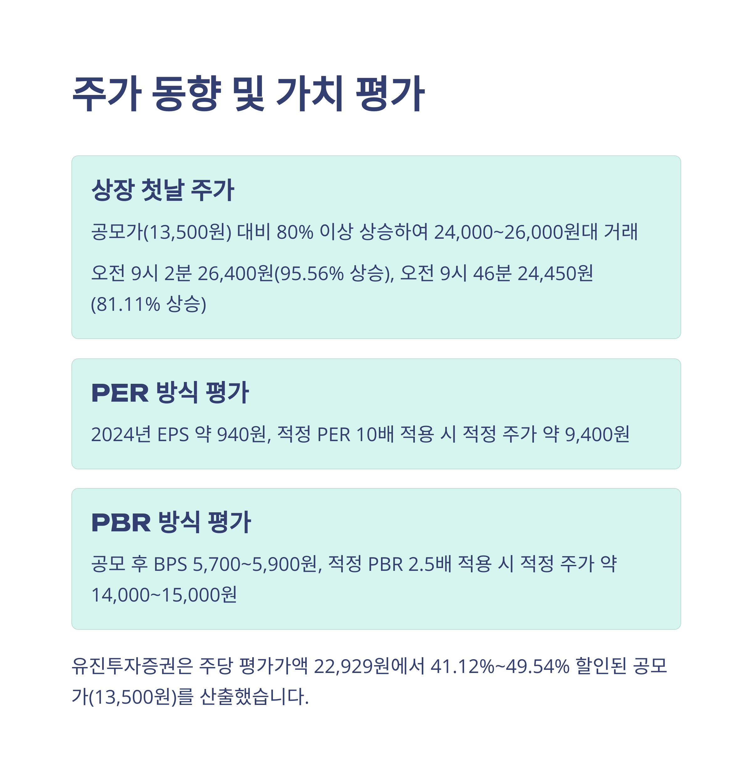 - 유진투자증권 분석: 주당 평가가액 22,929원에서 41.12%~49.54% 할인된 공모가(13,500원) 산출