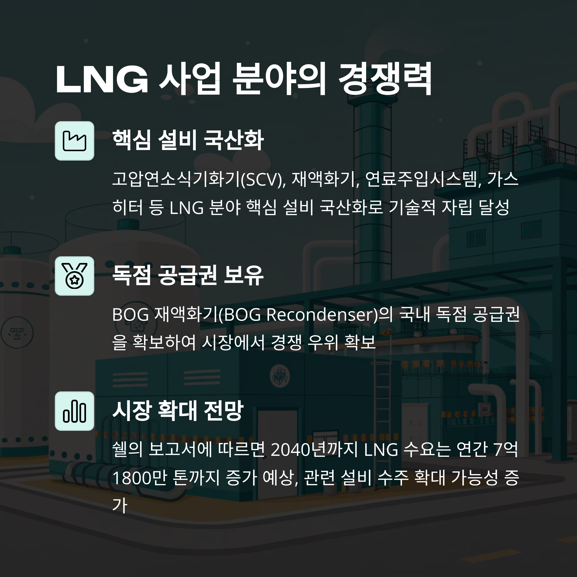 원일티엔아이는 LNG 분야에서 고압연소식기화기(SCV), 재액화기, 연료주입시스템, 가스히터 등을 국산화하며 기술적 자립을 이뤘습니다. 특히 BOG 재액화기(BOG Recondenser)는 국내 독점 공급권을 보유해 해당 분야에서 경쟁 우위를 점하고 있습니다.