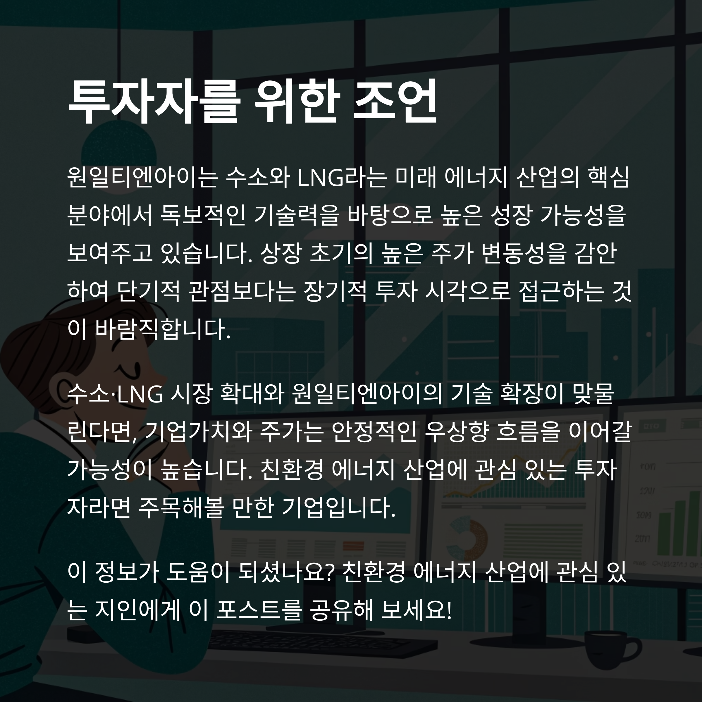 원일티엔아이는 수소와 LNG라는 미래 에너지 산업의 핵심 분야에서 독보적인 기술력을 기반으로 성장 가능성이 높은 기업으로 평가됩니다. 상장 첫날의 강한 주가 상승은 시장의 긍정적 기대를 반영하며, 중장기적으로는 에너지 전환 시대를 선도하는 기업으로서 지속적인 매출과 수익 성장, 주가 상승이 예상됩니다.