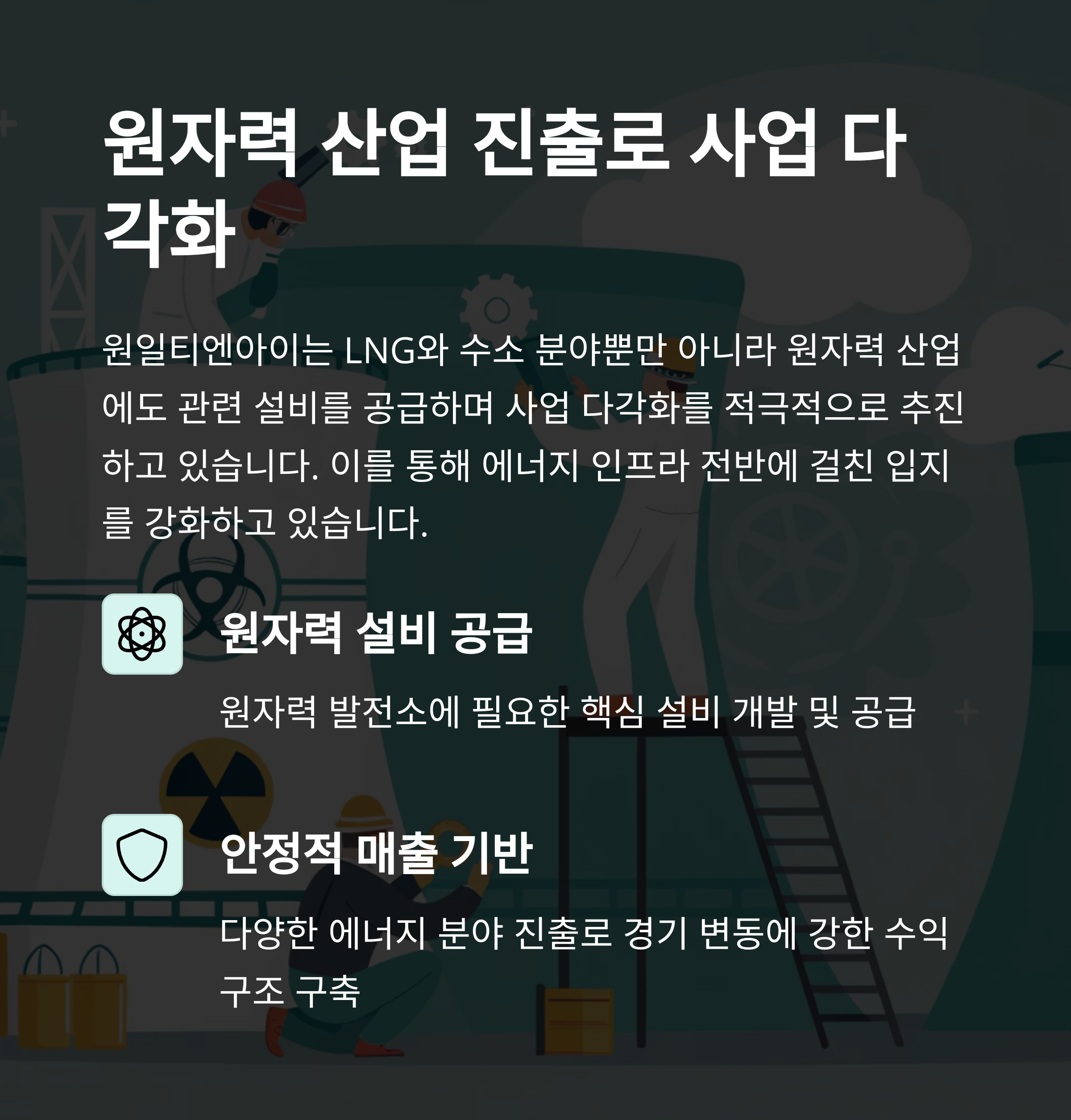 원자력 산업에서도 원일티엔아이는 관련 설비를 공급하며 사업 다각화를 추진하고 있습니다. 이를 통해 에너지 인프라 전반에 대한 입지를 강화하고 안정적 매출 기반을 마련하고 있습니다.