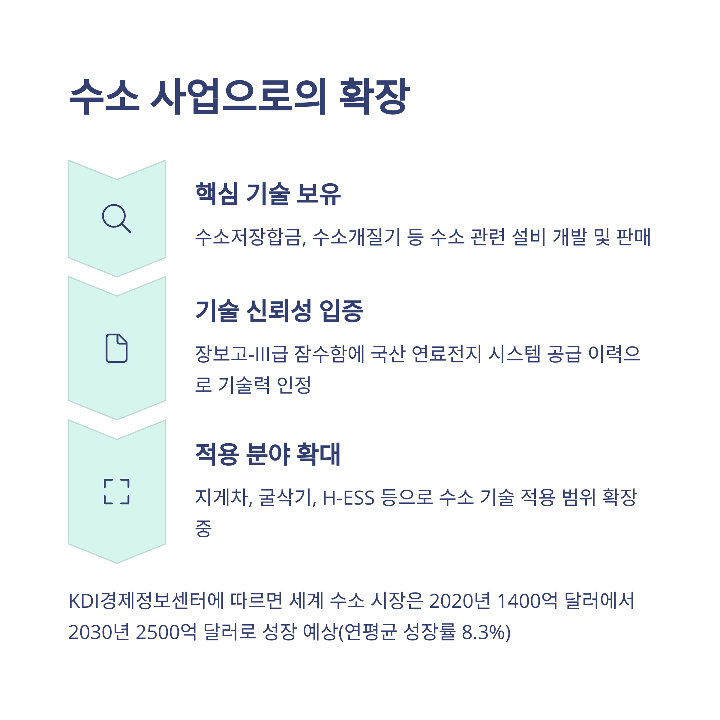수소저장합금, 수소개질기 등 수소 관련 설비를 개발·판매하며 수소 경제에 대응하고 있습니다. 장보고-III급 잠수함에 국산 연료전지 시스템을 공급한 이력은 기술 신뢰성을 입증한 사례로, 해당 기술은 지게차, 굴삭기, H-ESS 등으로 적용 분야가 확대되고 있습니다.