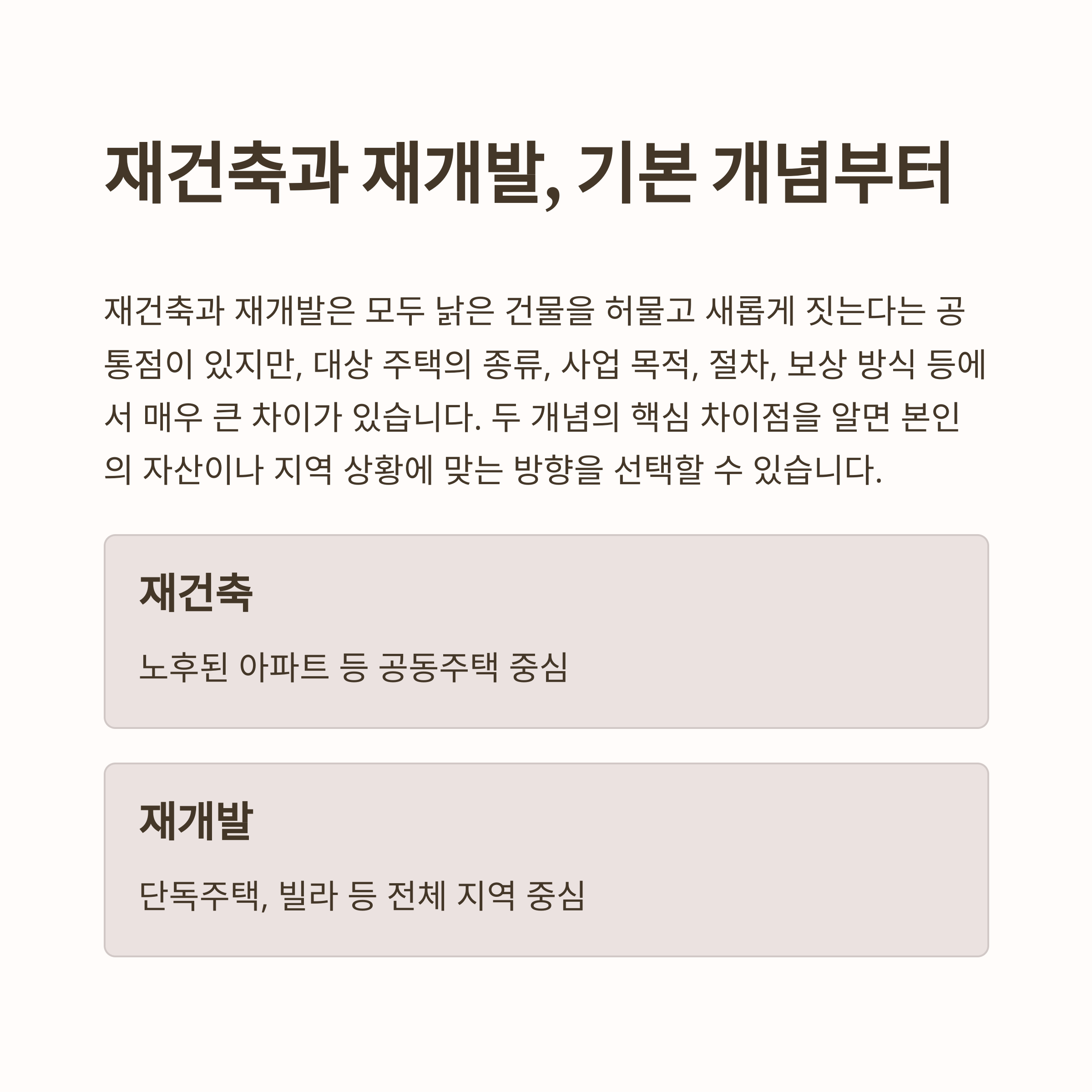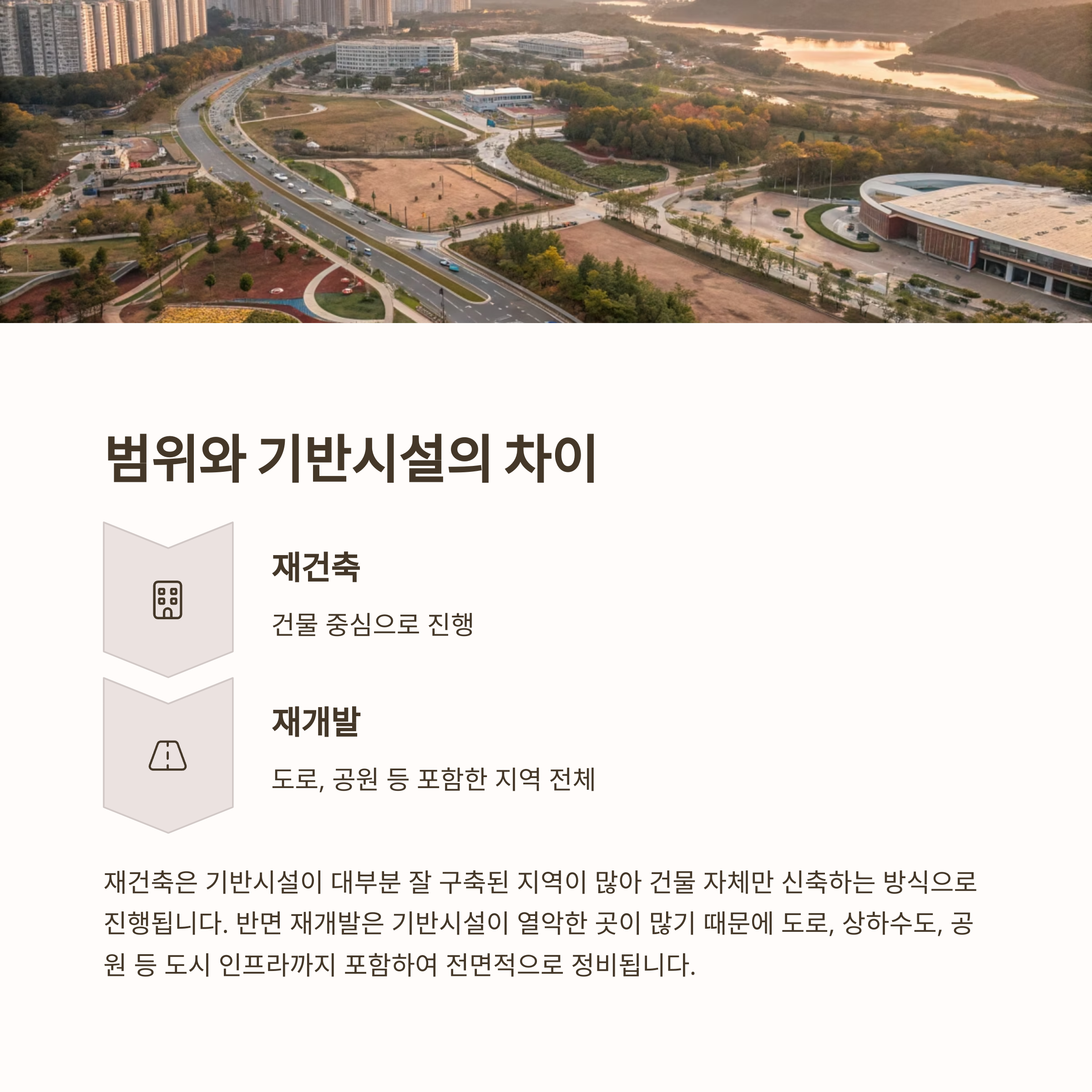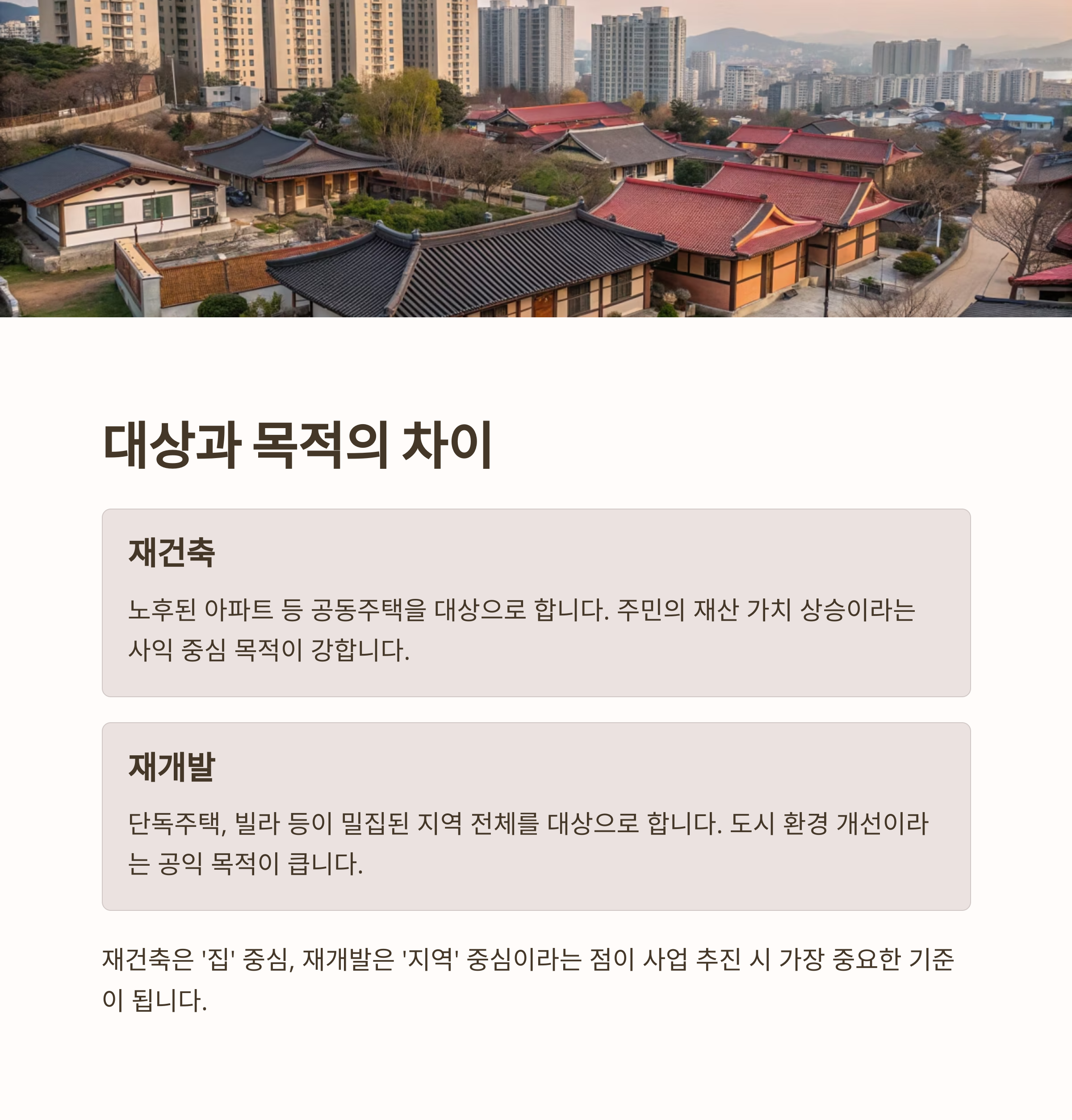 재건축과 재개발은 모두 낡은 건물을 허물고 새롭게 짓는다는 공통점이 있지만, 대상 주택의 종류, 사업 목적, 절차, 보상 방식 등에서 매우 큰 차이가 있습니다. 이 글에서는 헷갈리기 쉬운 두 개념의 핵심 차이점 8가지를 정리하고, 실제 추진 과정에서 주의해야 할 사항들을 쉽게 설명드립니다.