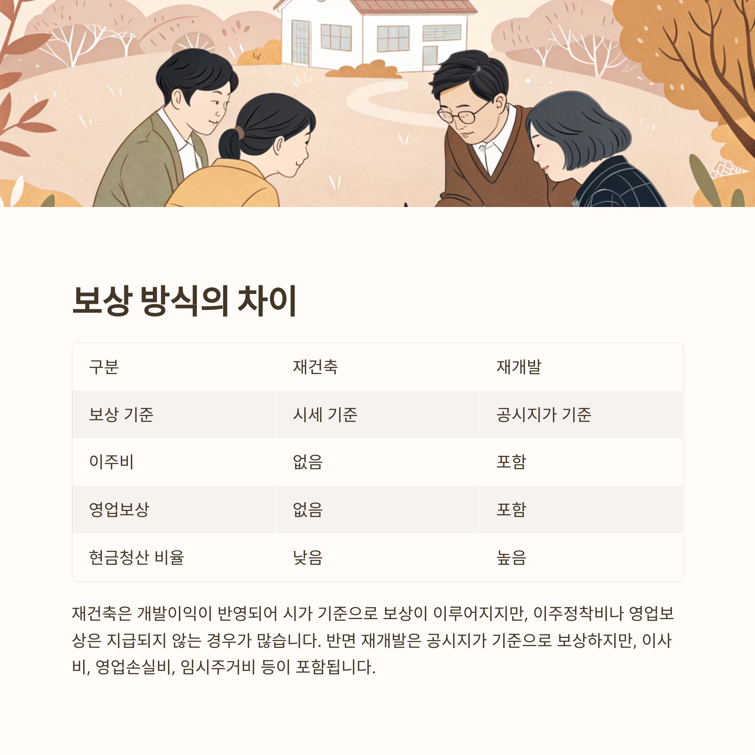 | 보상 방식 | 시세 기준, 이주비 없음 | 공시지가 기준, 이주비·영업보상 포함 |
