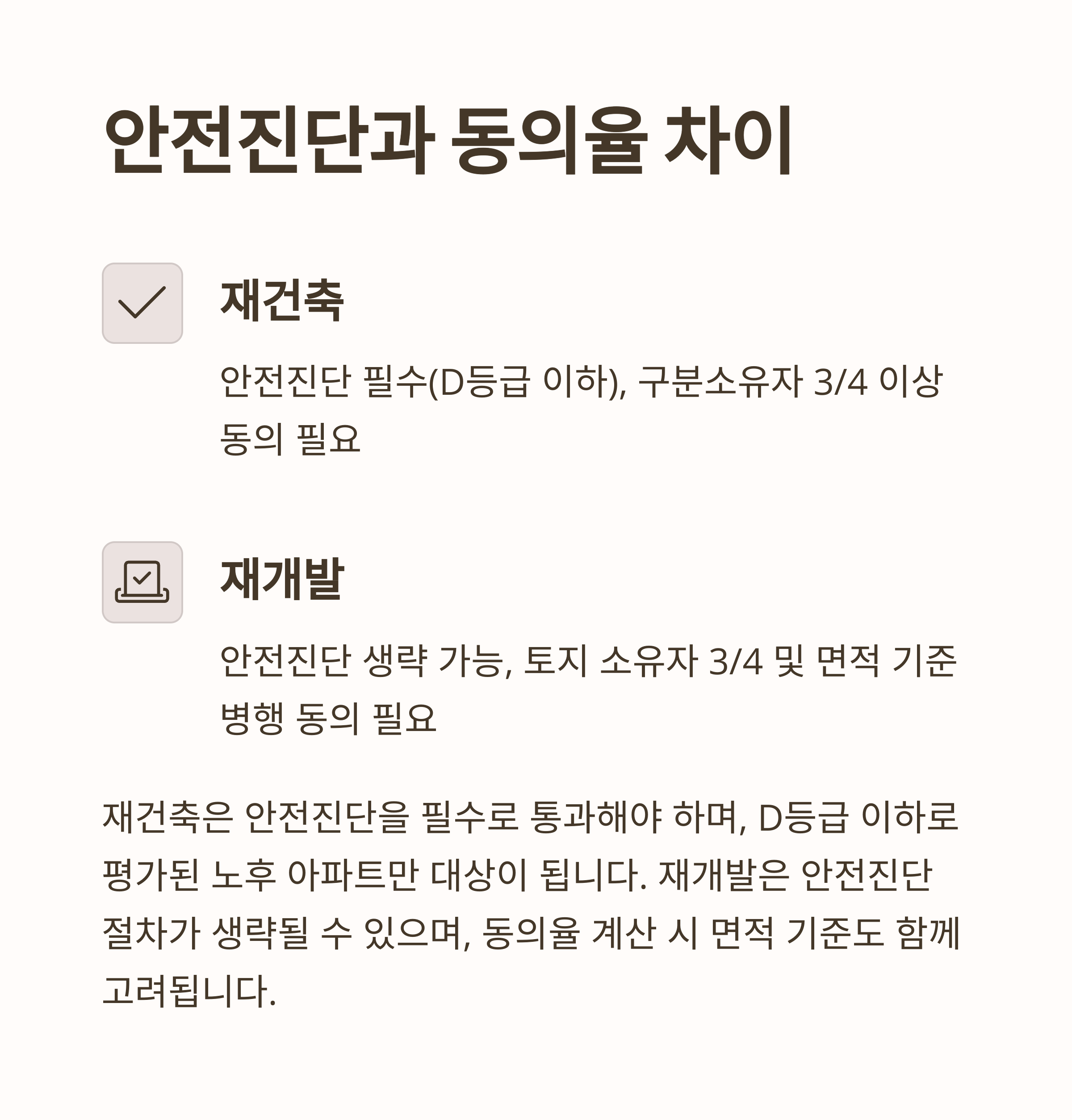 | 동의율 | 구분소유자 3/4 이상 | 토지 소유자 3/4, 면적 기준 병행 |
