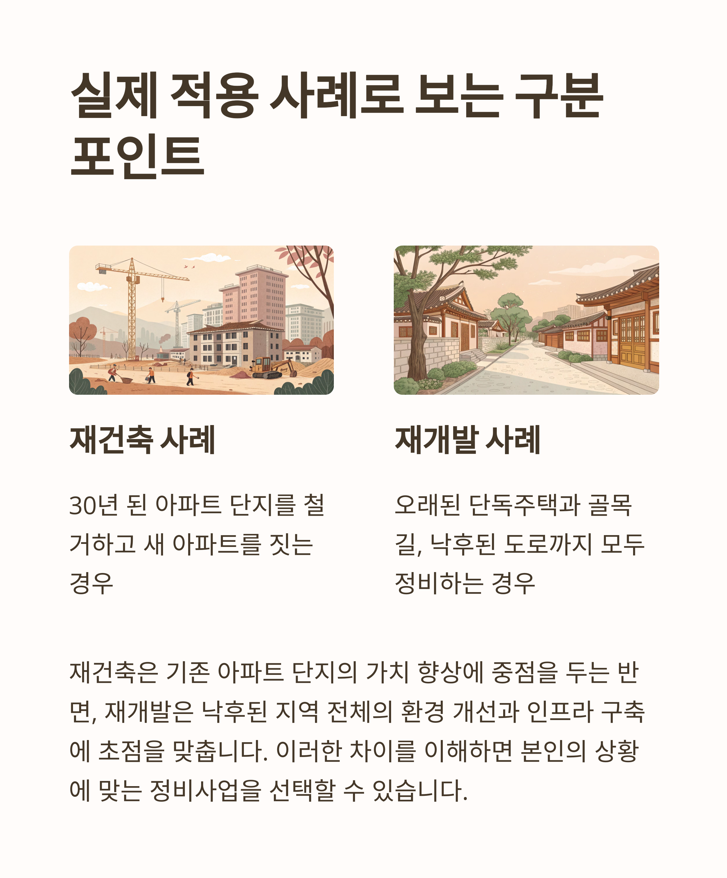 재건축은 가치 상승에 중점, 재개발은 도시 환경 정비에 중점이라는 기준을 명확히 이해한다면