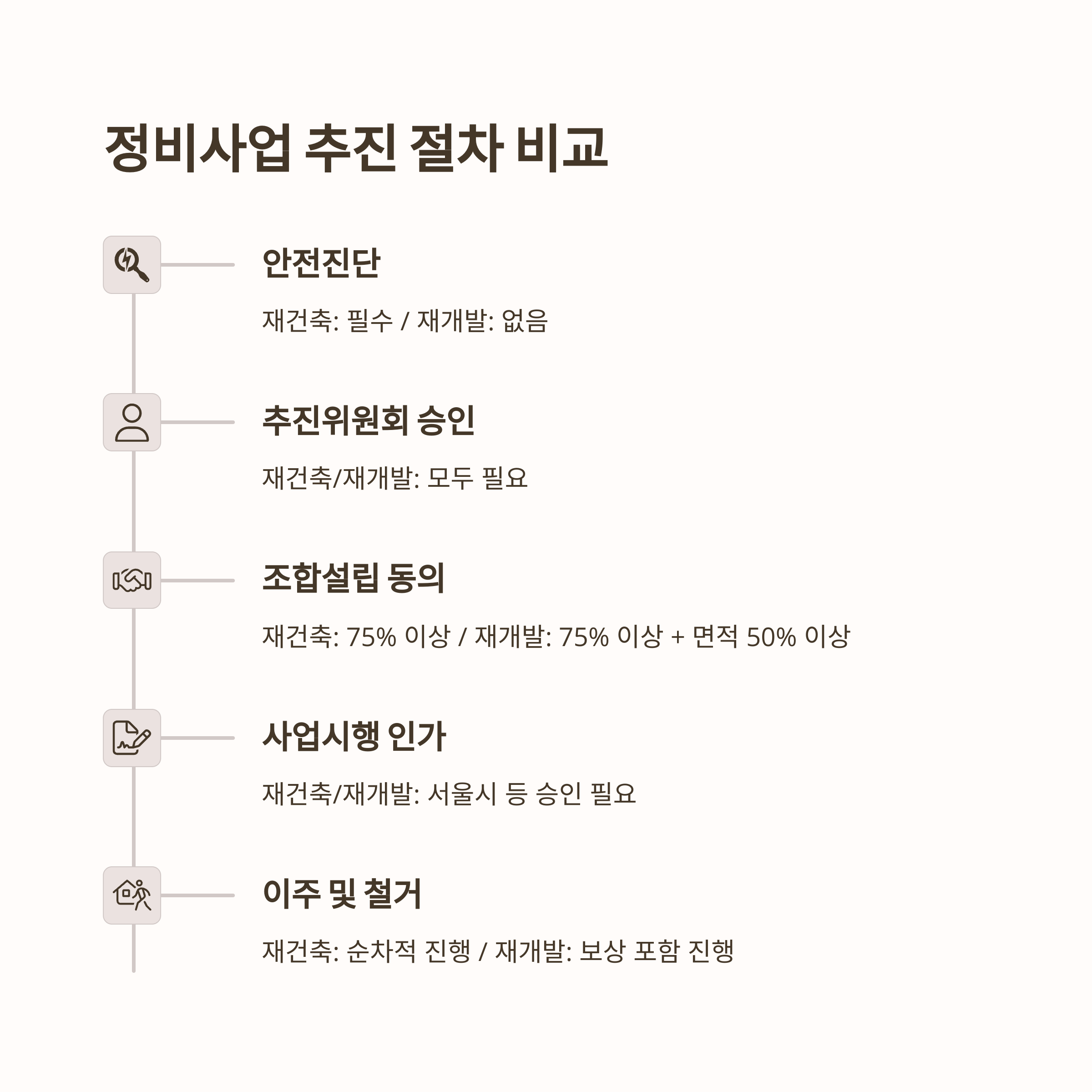 재건축과 재개발은 서로 다른 목적과 절차를 따릅니다. 다음 표에서 가장 중요한 기준들을 한눈에 확인할 수 있습니다.