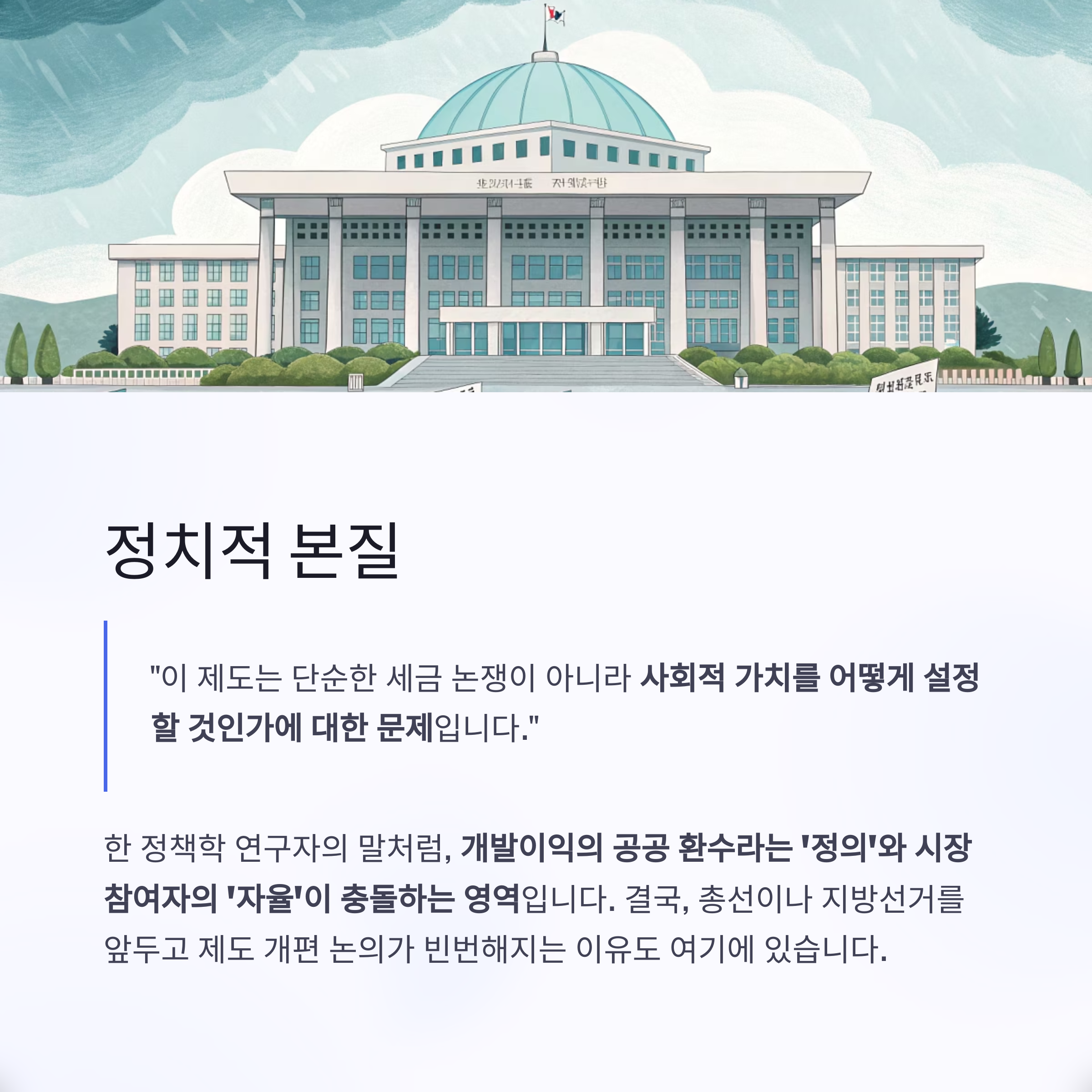 - 한 정책학 연구자의 말처럼, 개발이익의 공공 환수라는 ‘정의’와 시장 참여자의 ‘자율’이 충돌하는 영역입니다.