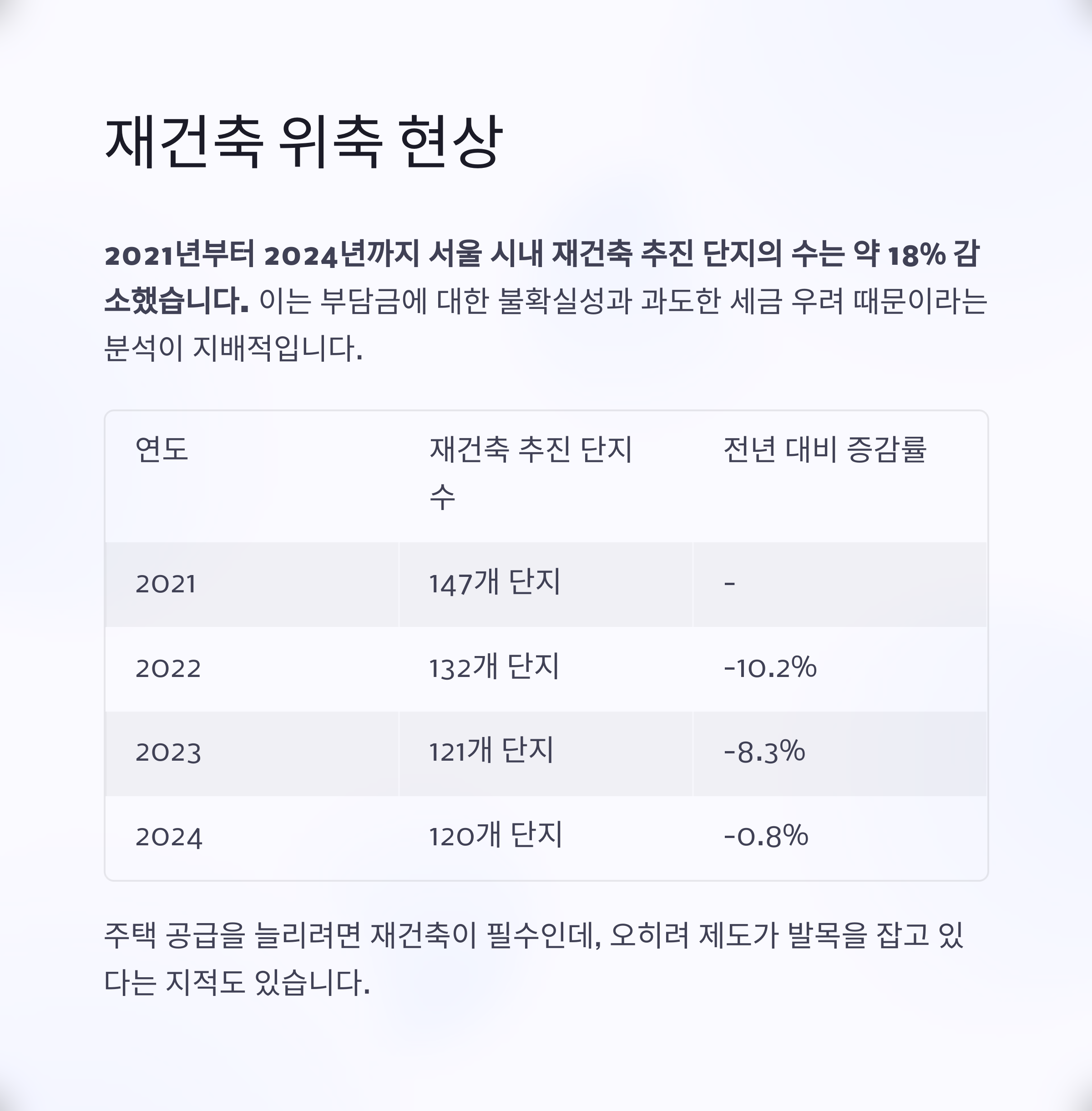 주택 공급을 늘리려면 재건축이 필수인데, 오히려 제도가 발목을 잡고 있다는 지적도 있습니다.