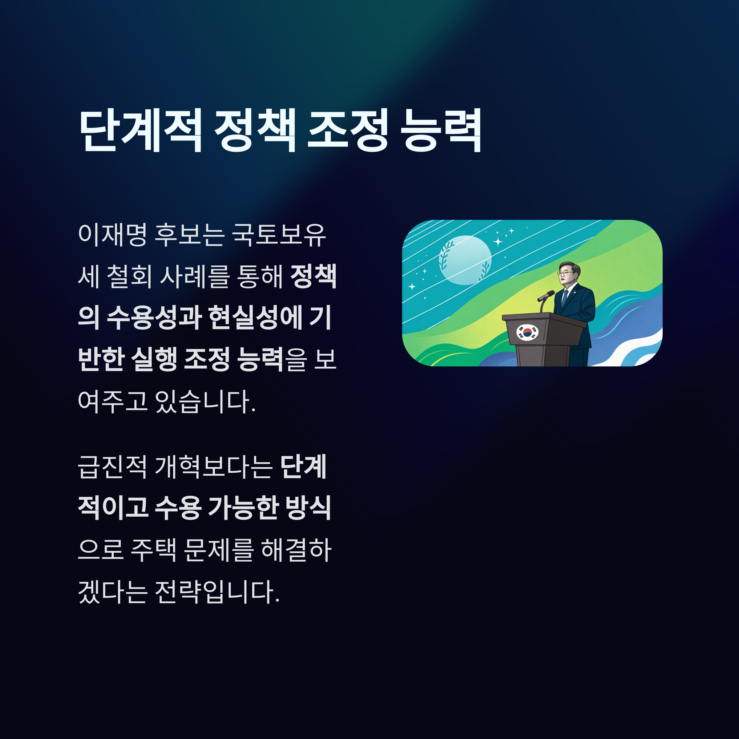 이재명 후보는 국토보유세 철회와 같은 사례를 통해 정책의 수용성과 현실성에 기반한 실행 조정 능력을 보여주고 있습니다.