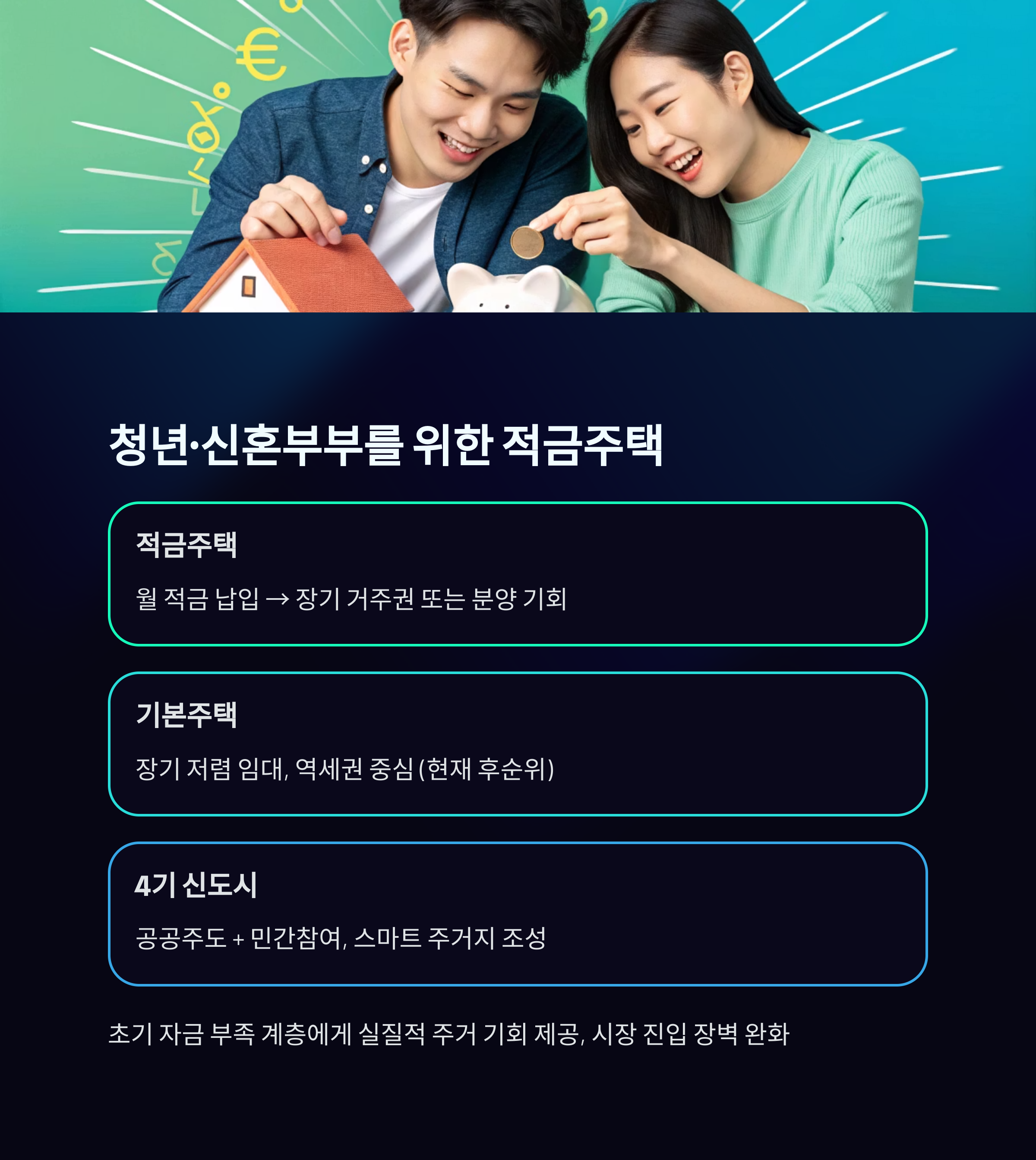 ‘적금주택’은 청년이나 신혼부부가 매월 일정 금액을 적금식으로 납입하면, 일정 시점 이후 분양이나 장기임대 기회를 제공하는 구조입니다.