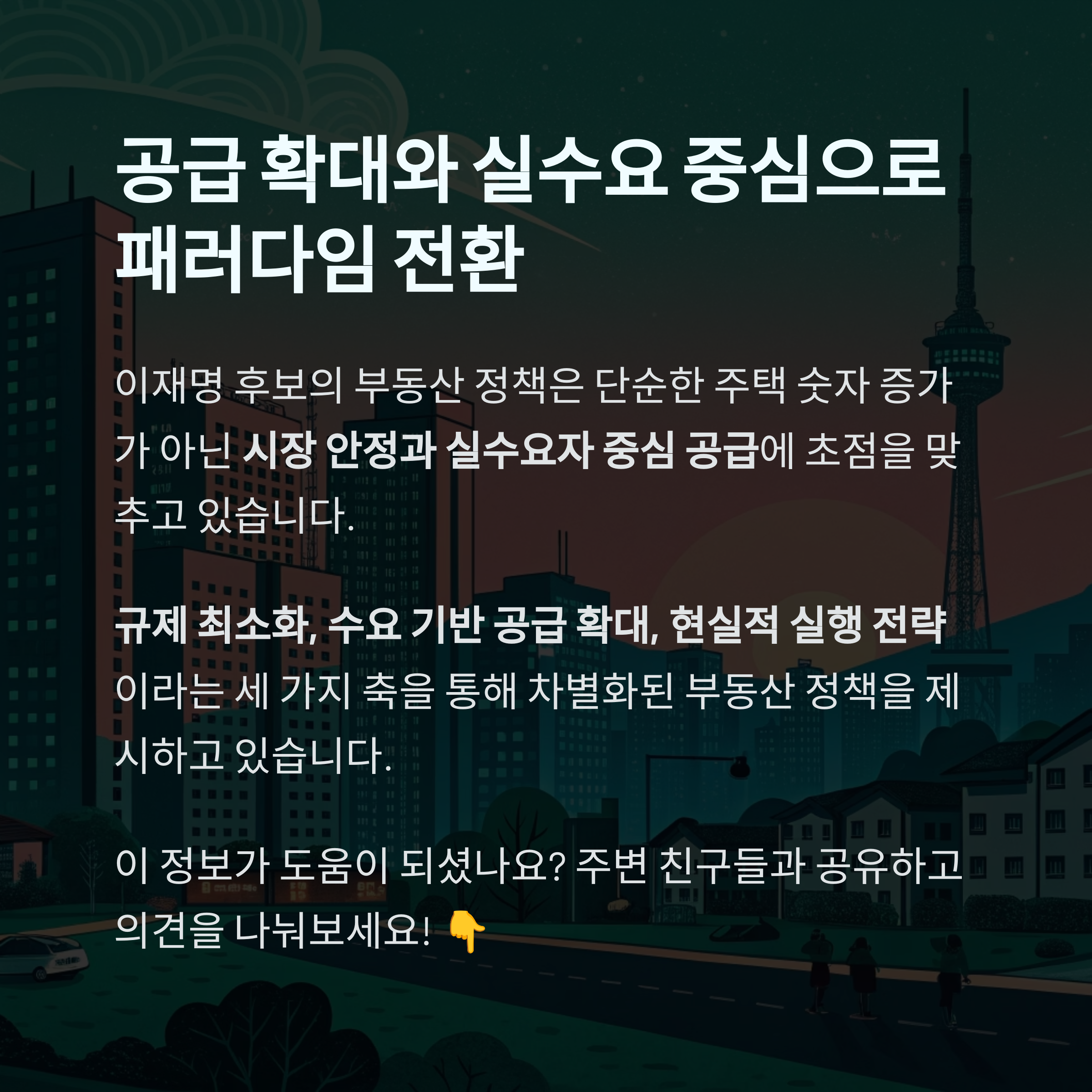 이재명 후보의 부동산 정책은 단순한 주택 숫자 증가가 아닌 시장 안정과 실수요자 중심 공급에 초점을 맞추고 있습니다.