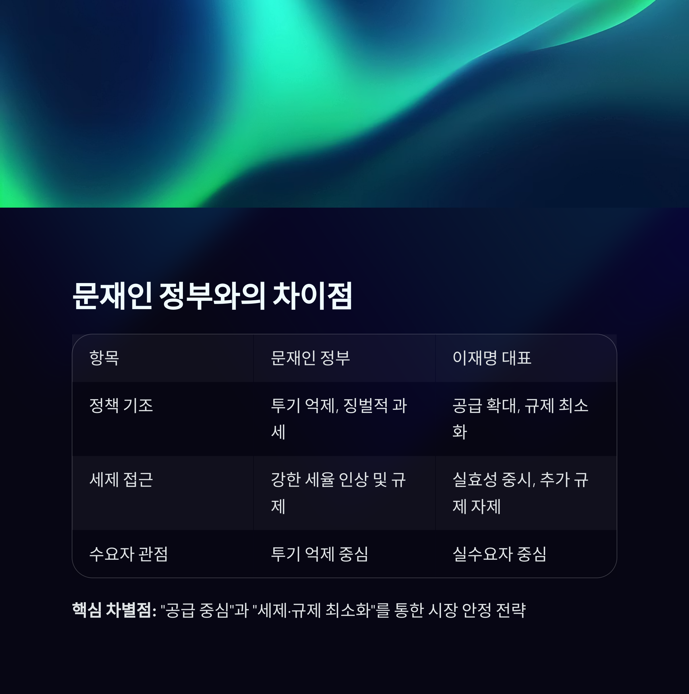 핵심 차별점은 “공급 중심”과 “세제·규제 최소화”를 통한 시장 안정 전략이라는 점입니다.
