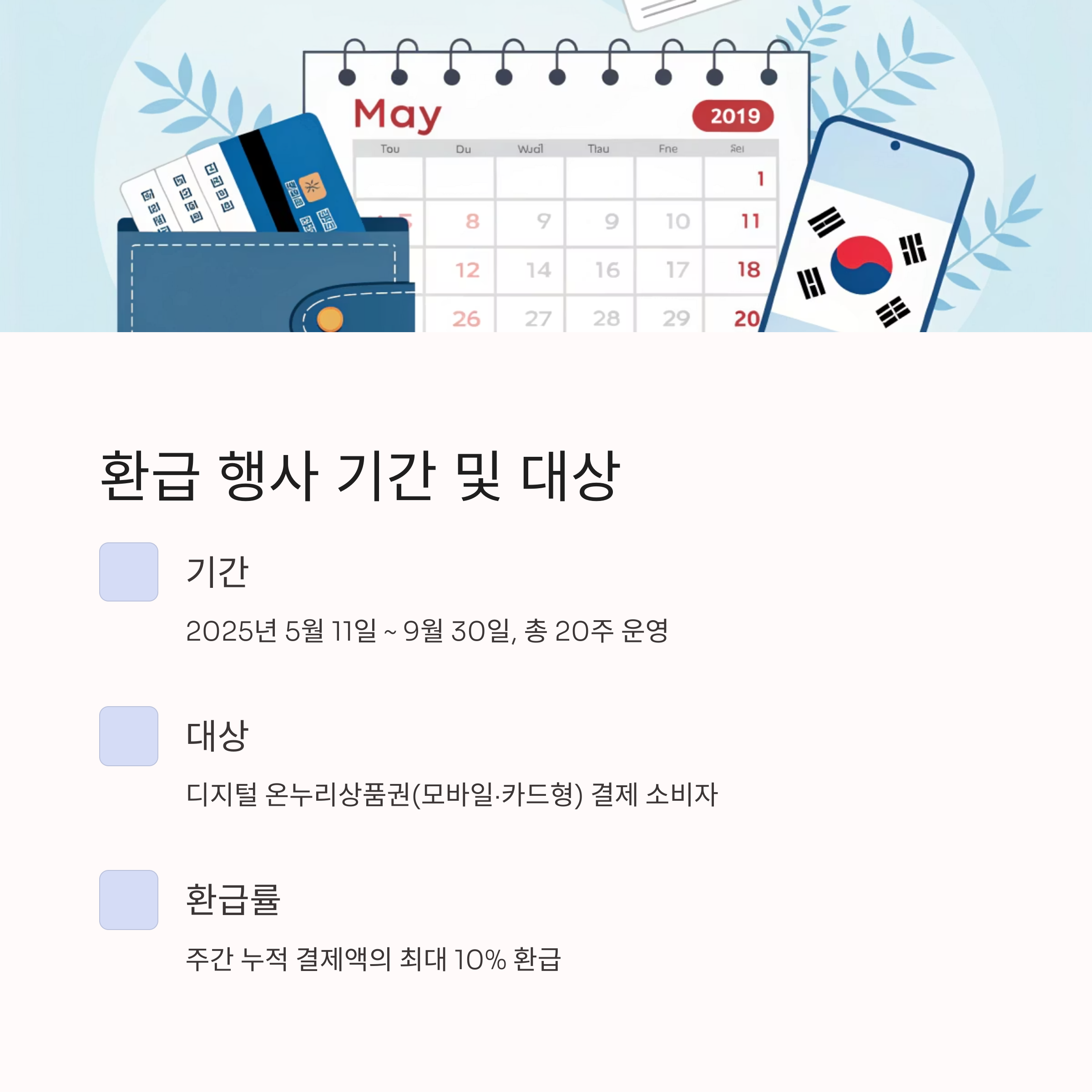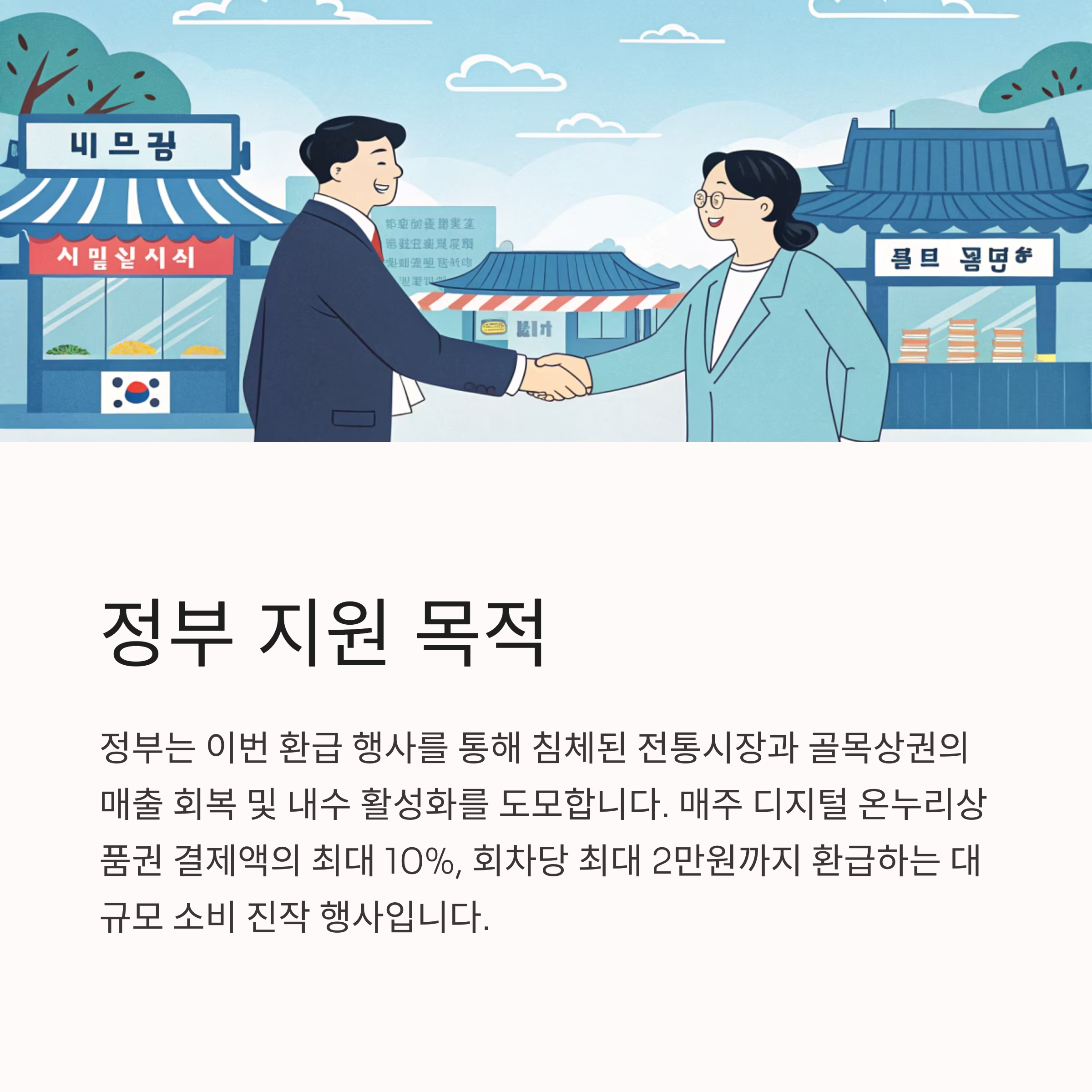2025년 5월부터 9월까지 매주 반복되는 디지털 온누리상품권 환급 행사는 소비자에게 최대 40만 원의 환급 혜택을 제공하며, 동시에 전통시장과 골목상권의 활성화를 돕기 위한 정부 정책입니다. 모바일 또는 카드형 상품권 사용자라면 누구나 참여할 수 있으며, 주간 누적 결제액 기준으로 최대 10%까지 돌려받을 수 있습니다.