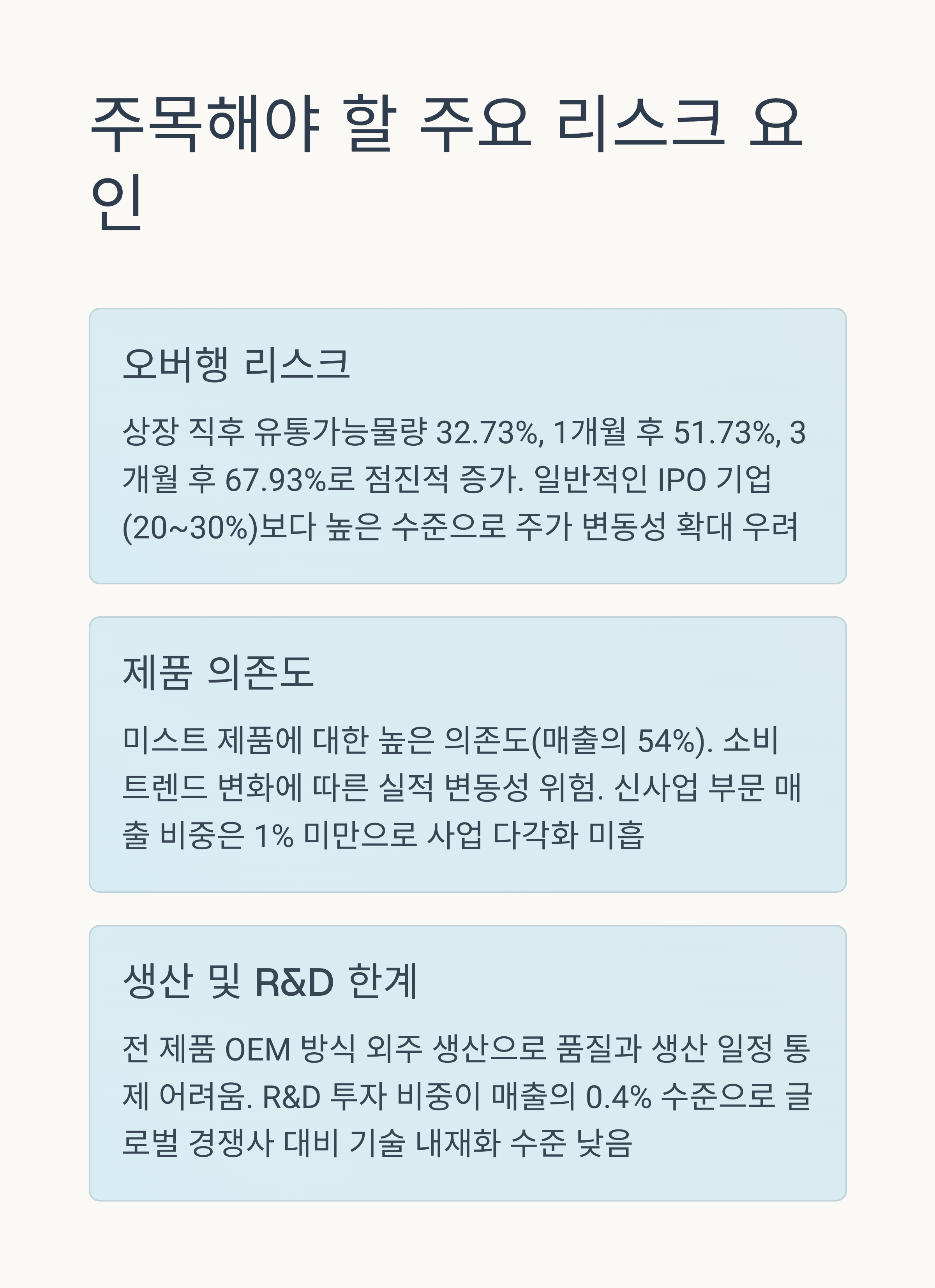 상장 이후 유통물량 확대와 제품 포트폴리오 한계 등은 향후 주가에 부담 요인으로 작용할 수 있습니다