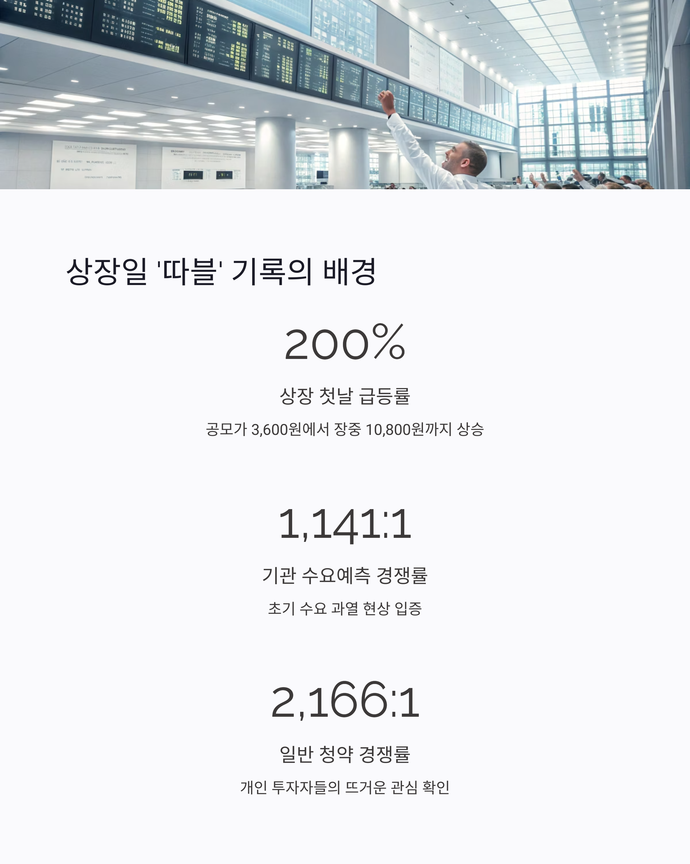 이러한 급등세는 기관 수요예측 경쟁률 1,141대 1, 일반 청약 경쟁률 2,166대 1이라는
