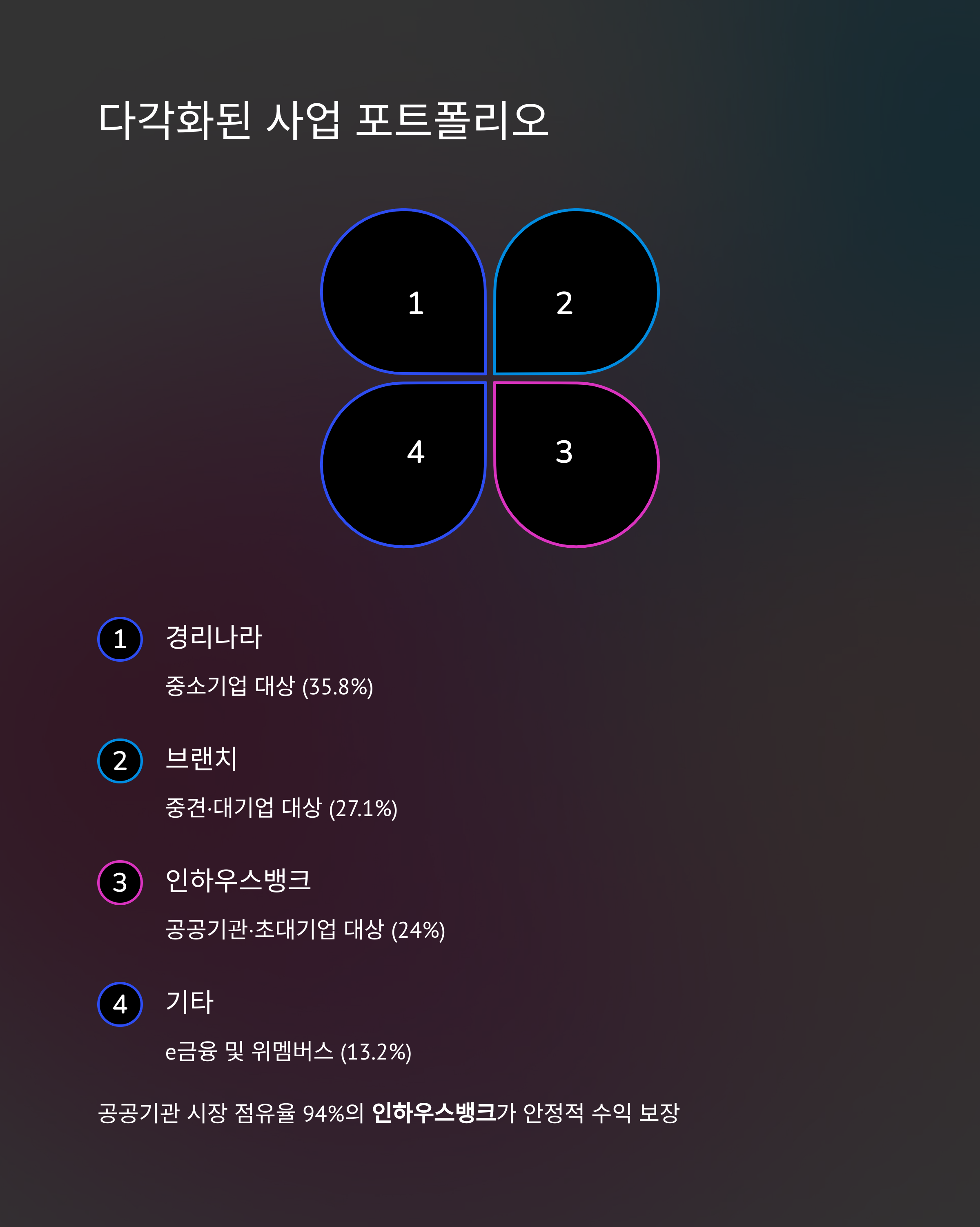 특히 공공기관 대상 시장 점유율이 94%에 이르는 인하우스뱅크는 지속적인 안정 수익을 보장합니다.