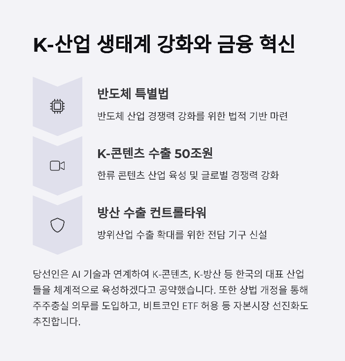 금융 부문에서도 파격적인 공약이 눈에 띕니다. 비트코인을 기초자산으로 하는 ETF 거래 허용, 원화 스테이블코인 발행, 기업지배구조 개선을 위한 상법 개정 등 자본시장 개혁에도 방점이 찍혀 있습니다.
