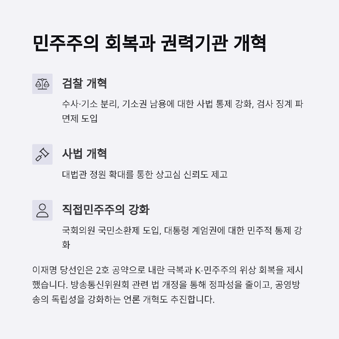 최근 몇 년간 권력기관의 신뢰도 하락과 정치권의 갈등은 국민 피로도를 높여왔습니다. 이재명 대통령은 계엄권 민주적 통제, 국회의원 국민소환제 도입, 검찰의 기소권 제한 등의 권력기관 개혁 공약을 통해 민주주의의 본래 가치를 회복하고자 합니다.