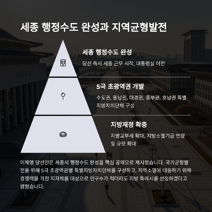 이재명 대통령은 세종에서 당선 직후 근무하겠다고 공약하며, 행정수도 완성을 전면에 내세웠습니다. 이는 정치·행정의 균형 발전을 위한 선언적 조치이며, 대통령실 및 국회 이전도 단계적으로 추진될 예정입니다.