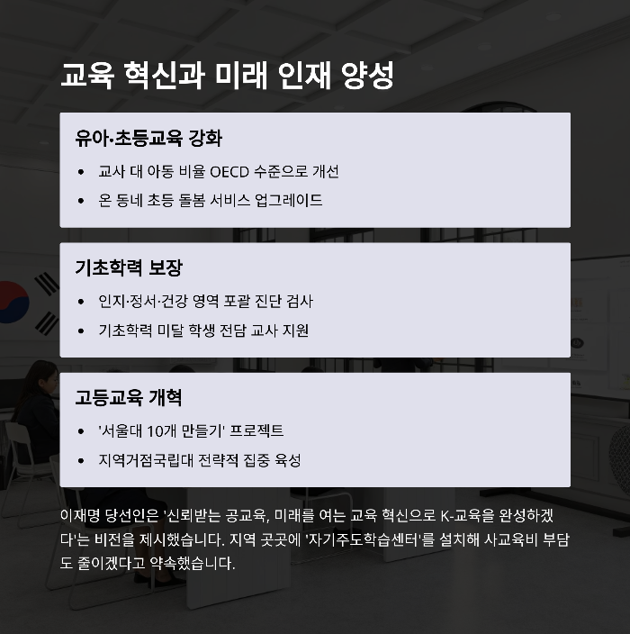 초·중등 교육에서는 기초학력 진단검사, 자기주도학습센터 설치, 교사 대 아동 비율 개선, 0~5세 영유아 교육비 확대 등이 포함되었습니다. 이는 교육의 질 향상과 사교육비 절감 효과를 동시에 기대할 수 있습니다.