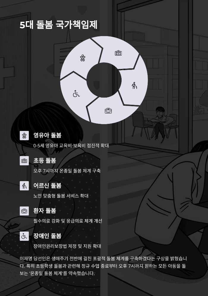 특히 주목할 만한 부분은 5대 돌봄 국가책임제입니다. 영유아부터 장애인, 어르신, 환자까지 생애 전 주기에 걸쳐 국가가 책임지는 돌봄 체계를 구축하겠다는 것이 핵심입니다. 초등학생 대상 온종일 돌봄 체계는 양육 부담을 줄이고 맞벌이 가정을 지원하는 데 실질적인 효과가 기대됩니다.