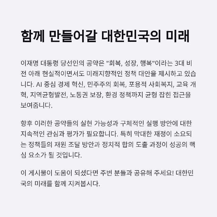 이재명 대통령의 공약은 분명히 방향성과 현실성이 있습니다. 다만 중요한 것은 이를 실현할 정치적 합의, 재원 조달 방안, 국민과의 소통입니다.