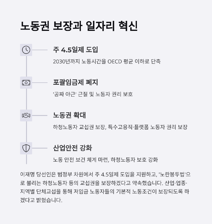 주 4.5일제 도입은 노동시간 단축과 삶의 질 향상을 목표로 하는 핵심 공약입니다. 더불어 포괄임금제 폐지, 하청노동자 교섭권 보장, 플랫폼 노동자 권리보호, 산업안전 강화, 장애인 교통 편의 확대 등은 변화하는 노동환경 속에서 노동권 보장을 강화하기 위한 방향입니다.