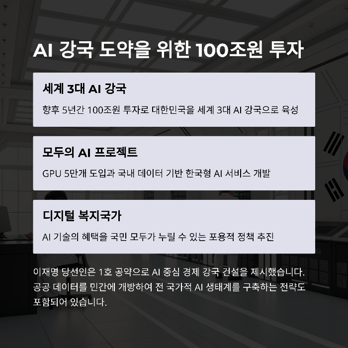 이재명 대통령의 1호 공약은 명확합니다. 100조 원을 투자해 대한민국을 세계 3대 AI 강국으로 만들겠다는 것입니다.