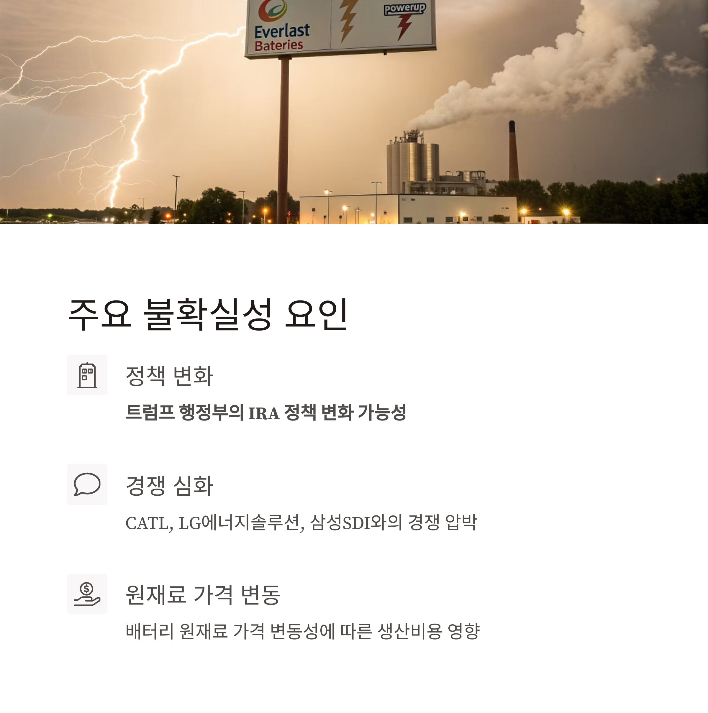 셋째, 배터리 원재료 가격 변동성도 생산비용에 큰 영향을 미치므로 리스크 관리가 중요합니다.