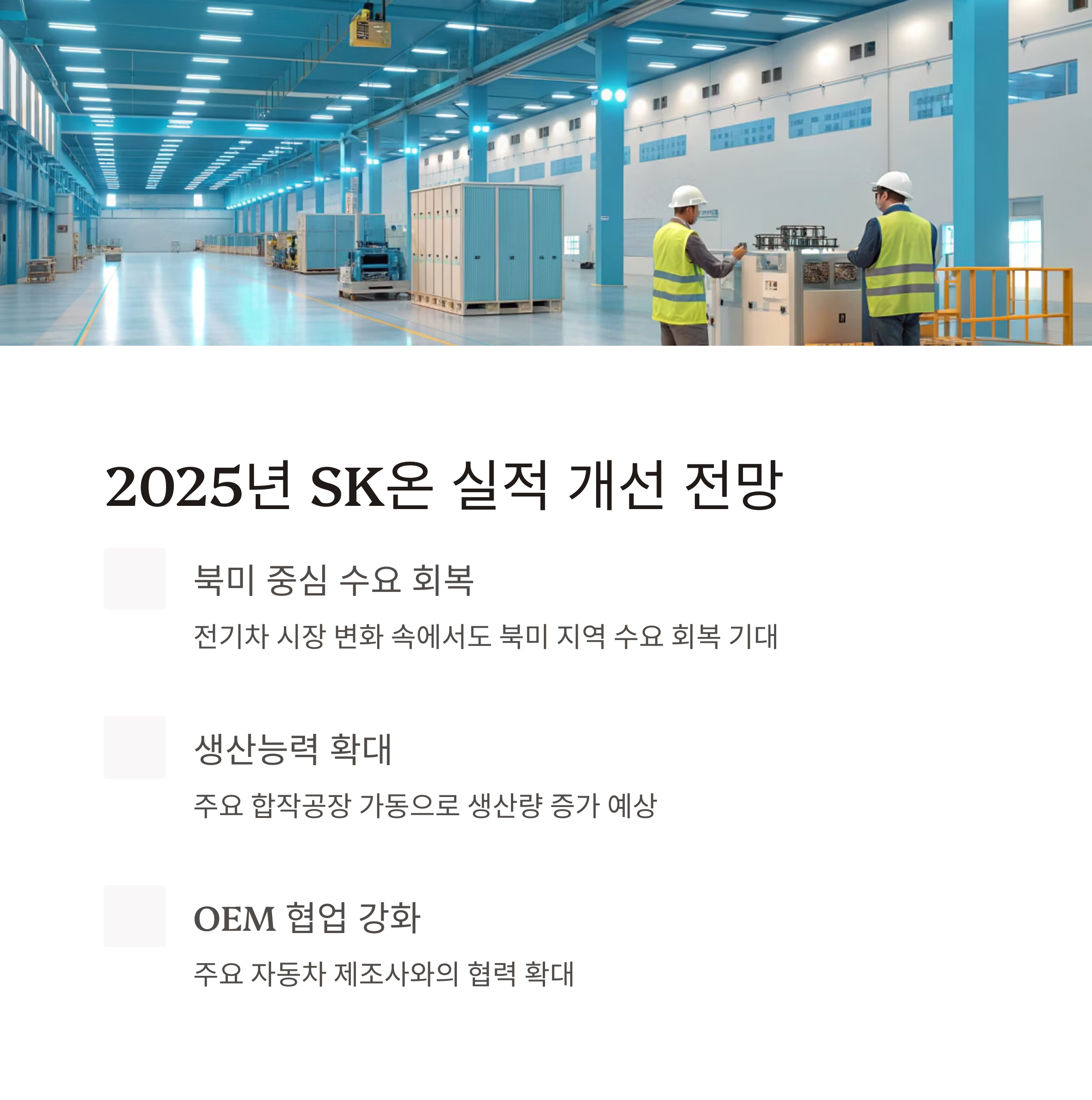 2025년 SK온의 성과는 북미 시장 내 배터리 공장 가동률 회복과 생산량 확대에 따라 좌우될 전망입니다.