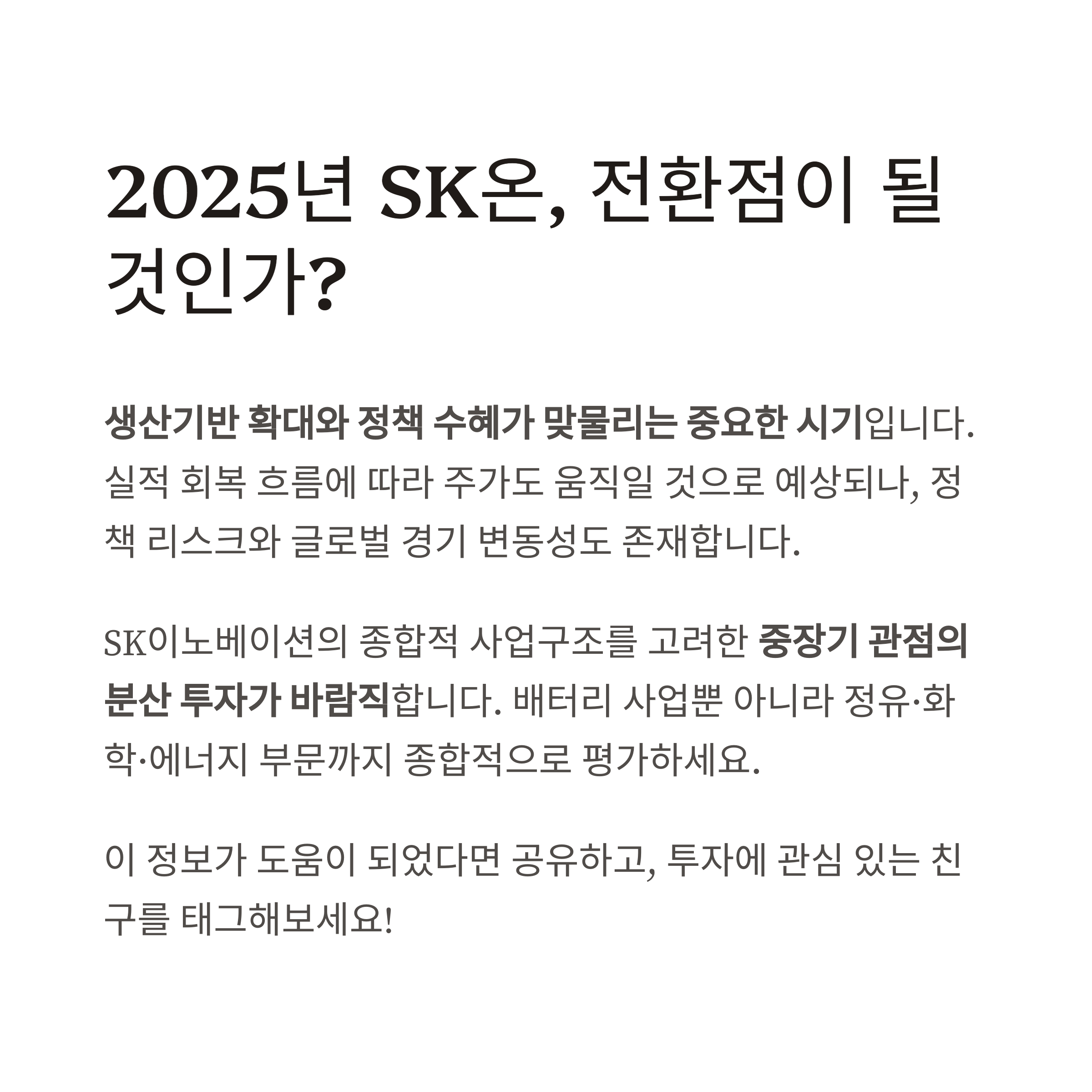 SK온의 2025년은 생산기반 확대와 정책 수혜 확대가 맞물리는 전환점이 될 가능성이 높습니다.
