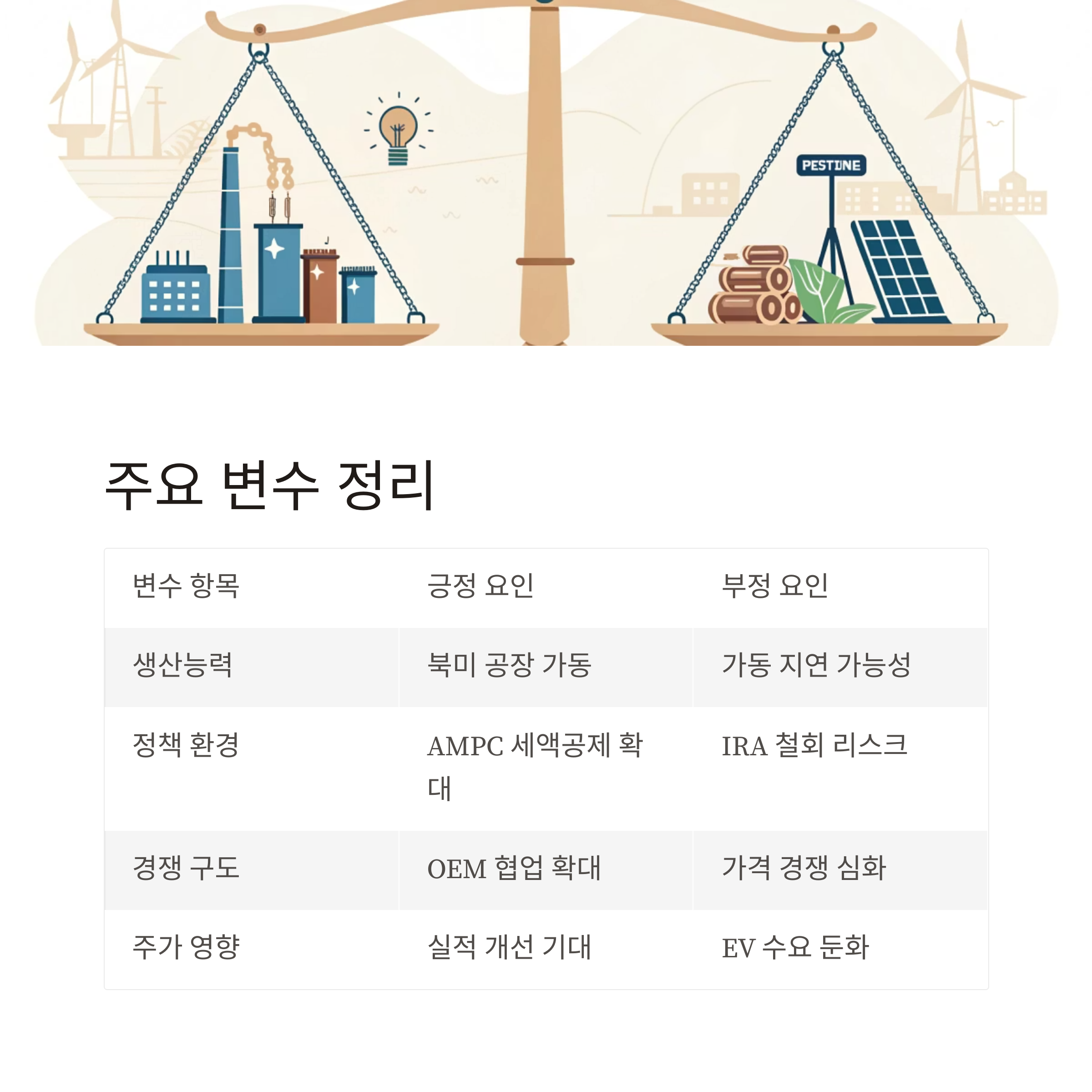 | 정책 환경 | AMPC 세액공제 확대 | IRA 철회 리스크 |
