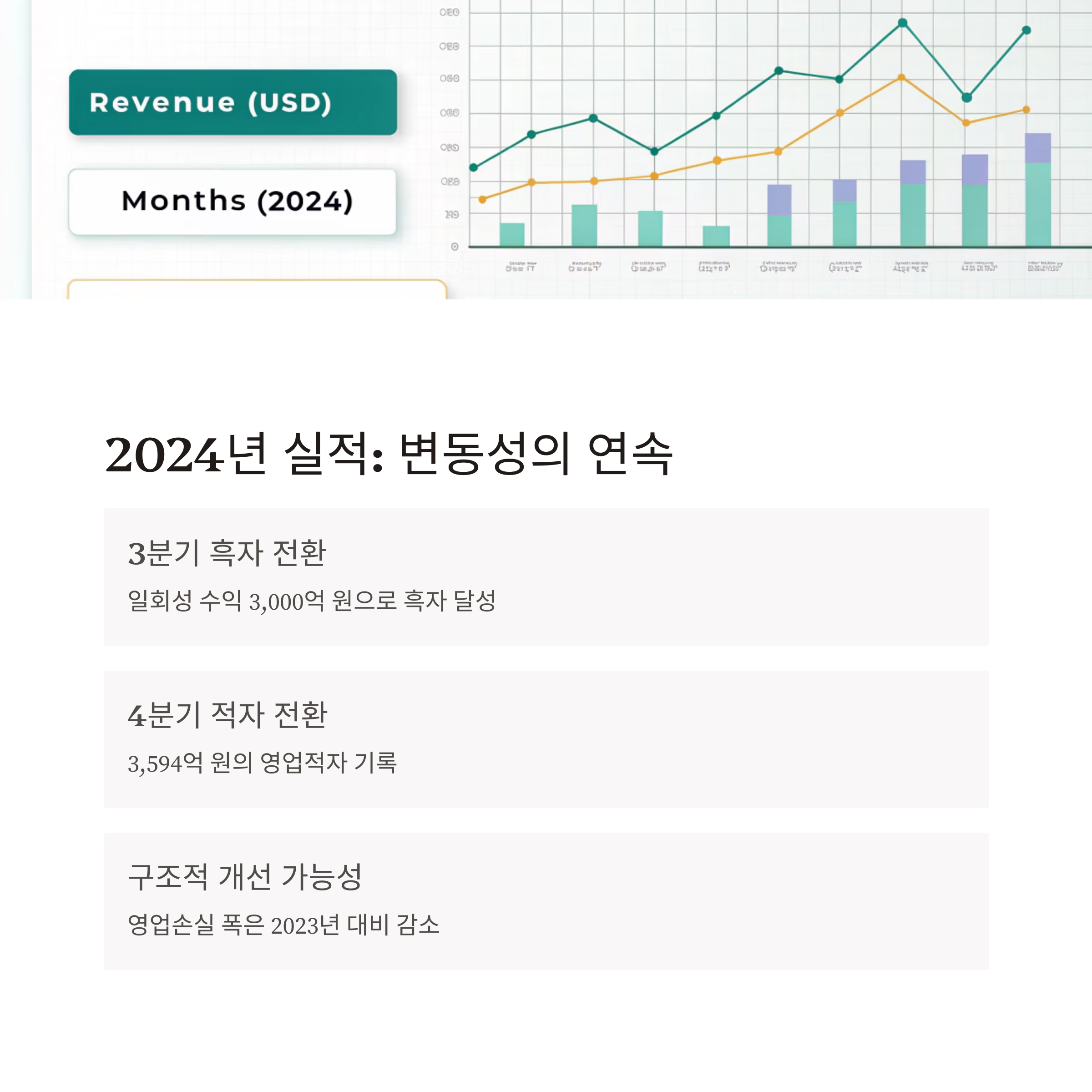 연간 실적 기준으로는 매출이 전년보다 감소했지만, 영업손실 폭은 2023년 대비 줄어들어 구조적 체질 개선의 가능성을 보여주었습니다.
