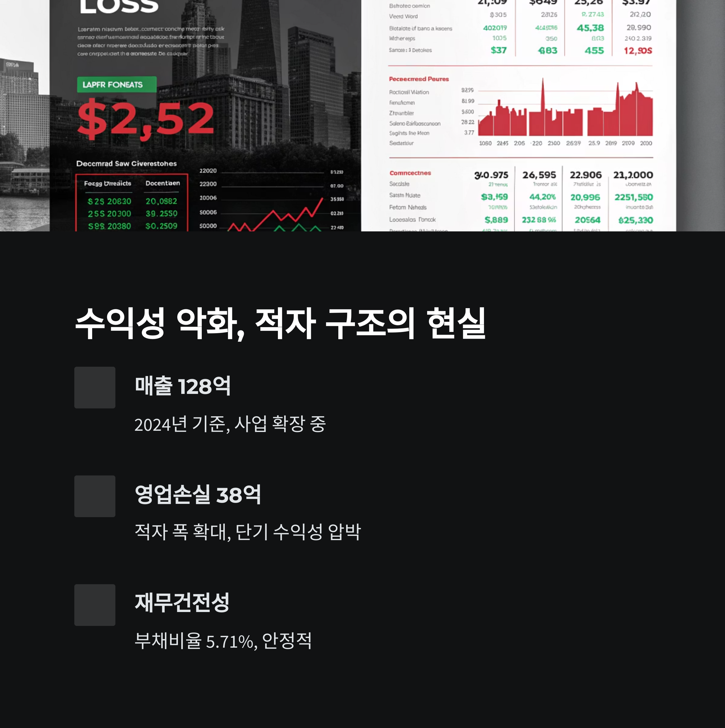 PER -58.55배, ROE -5.21% 등 수익성 지표는 여전히 부진합니다.