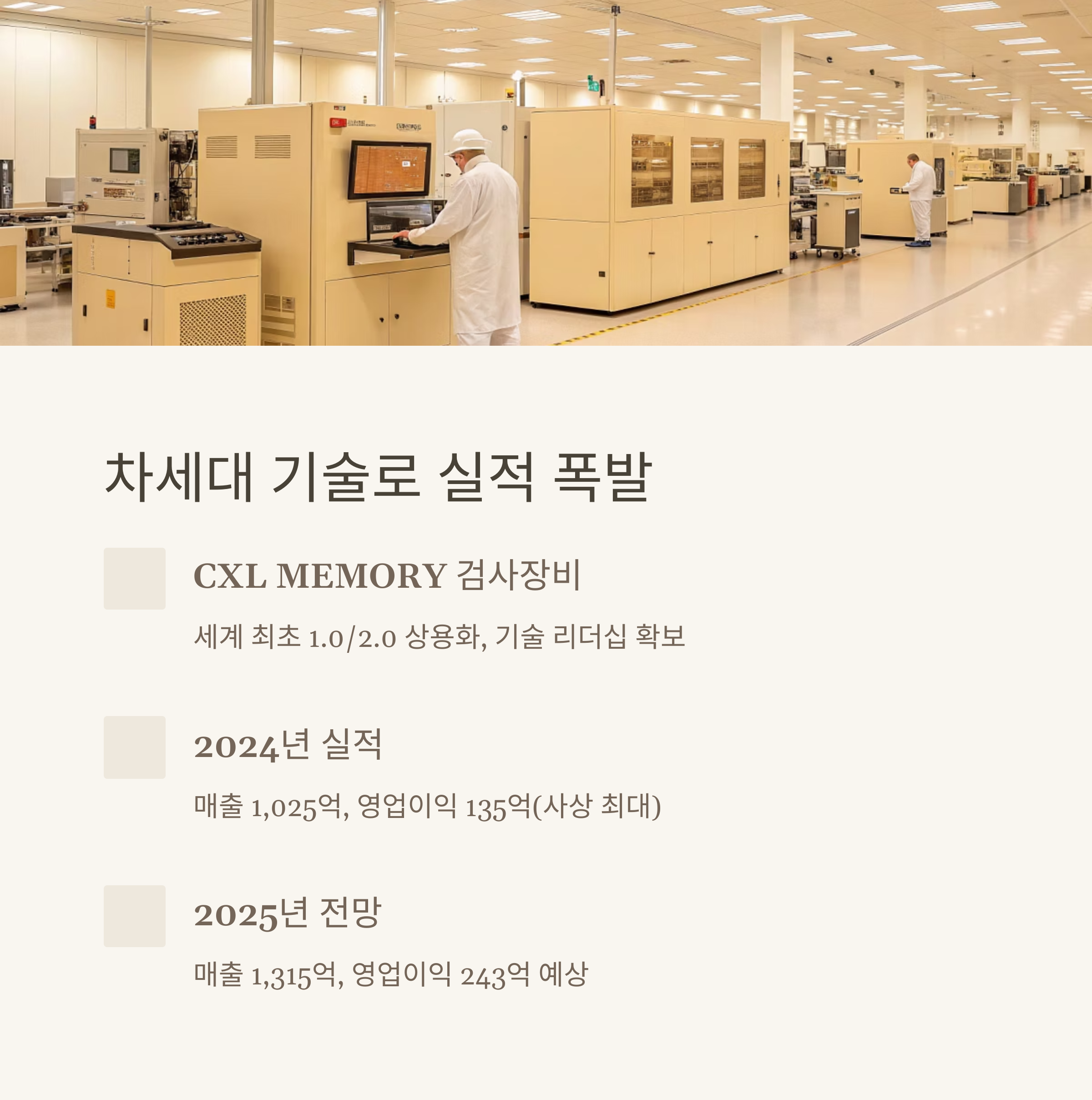 2025년에는 매출 1,315억 원, 영업이익 243억 원이 예상되며, 특히 SSD 테스터와 AI 서버용 DIMM 테스터 매출이 주도할 전망입니다.