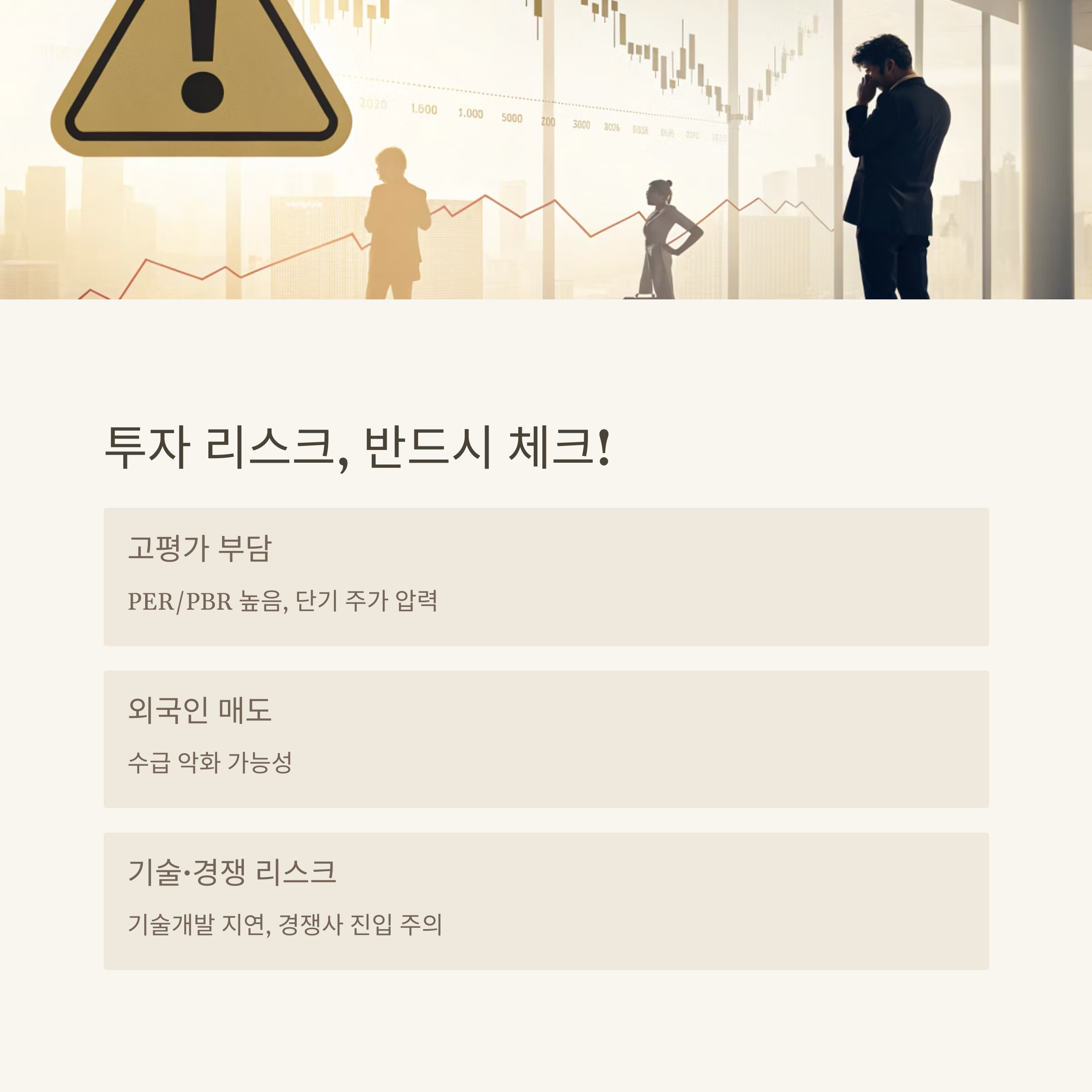 또한 외국인의 매도 전환이나 기술개발 지연, 글로벌 경쟁사의 시장 진입은 실적에 악영향을 줄 수 있습니다.
