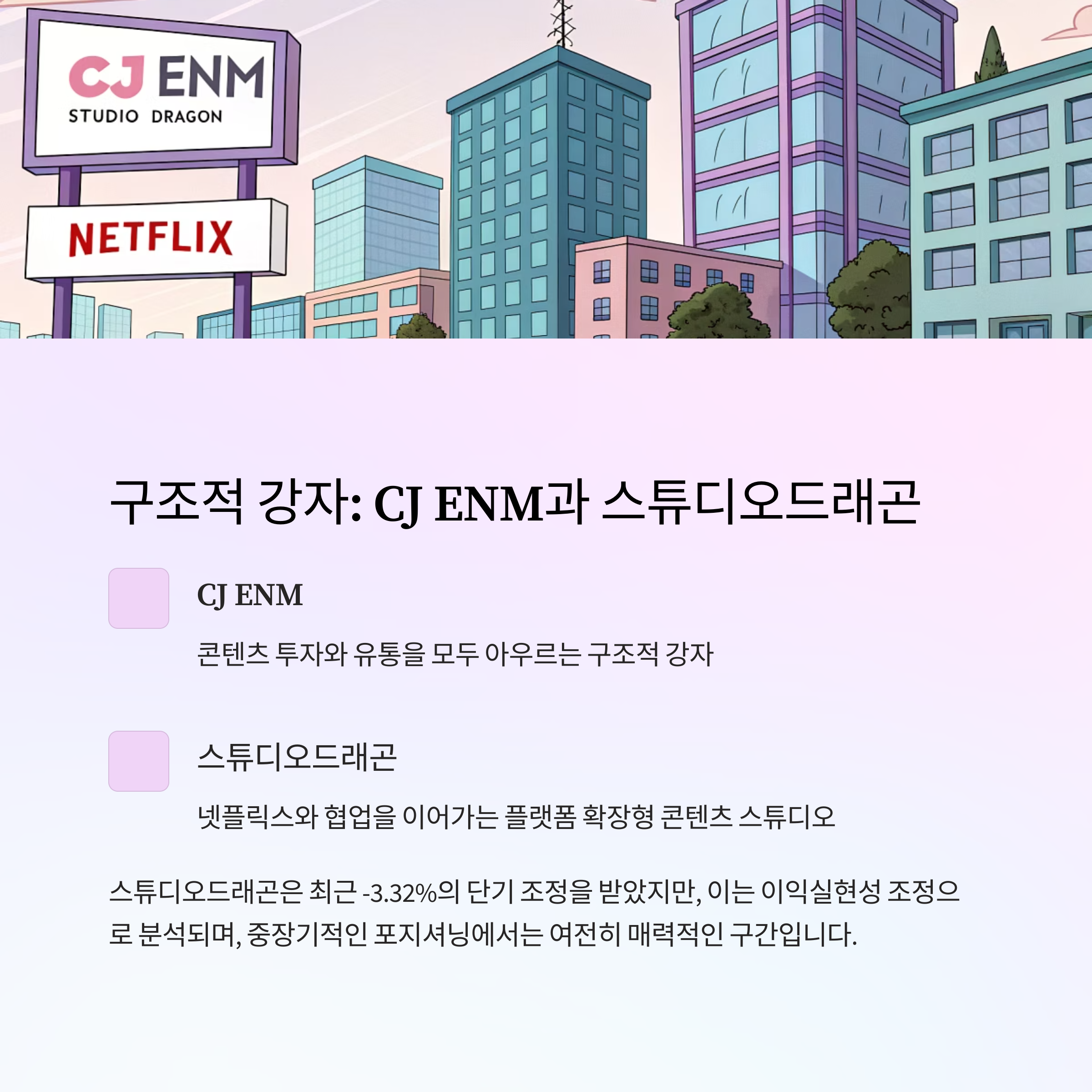 콘텐츠 투자와 유통을 모두 아우르는 구조적 강자입니다.