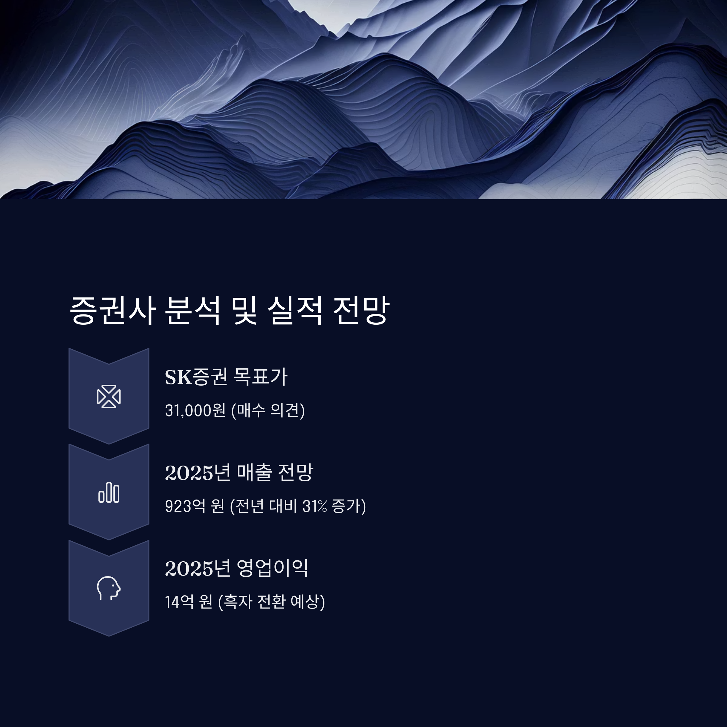 하나증권은 2025년 하반기를 기점으로 턴어라운드가 가능하다고 전망합니다. 2025년 매출액은 전년 대비 31% 증가한 923억 원, 영업이익은 14억 원으로 흑자 전환할 것으로 분석하고 있습니다. 이는 그간 지속된 적자 구조에서 벗어나는 중요한 전환점이 될 수 있습니다.
