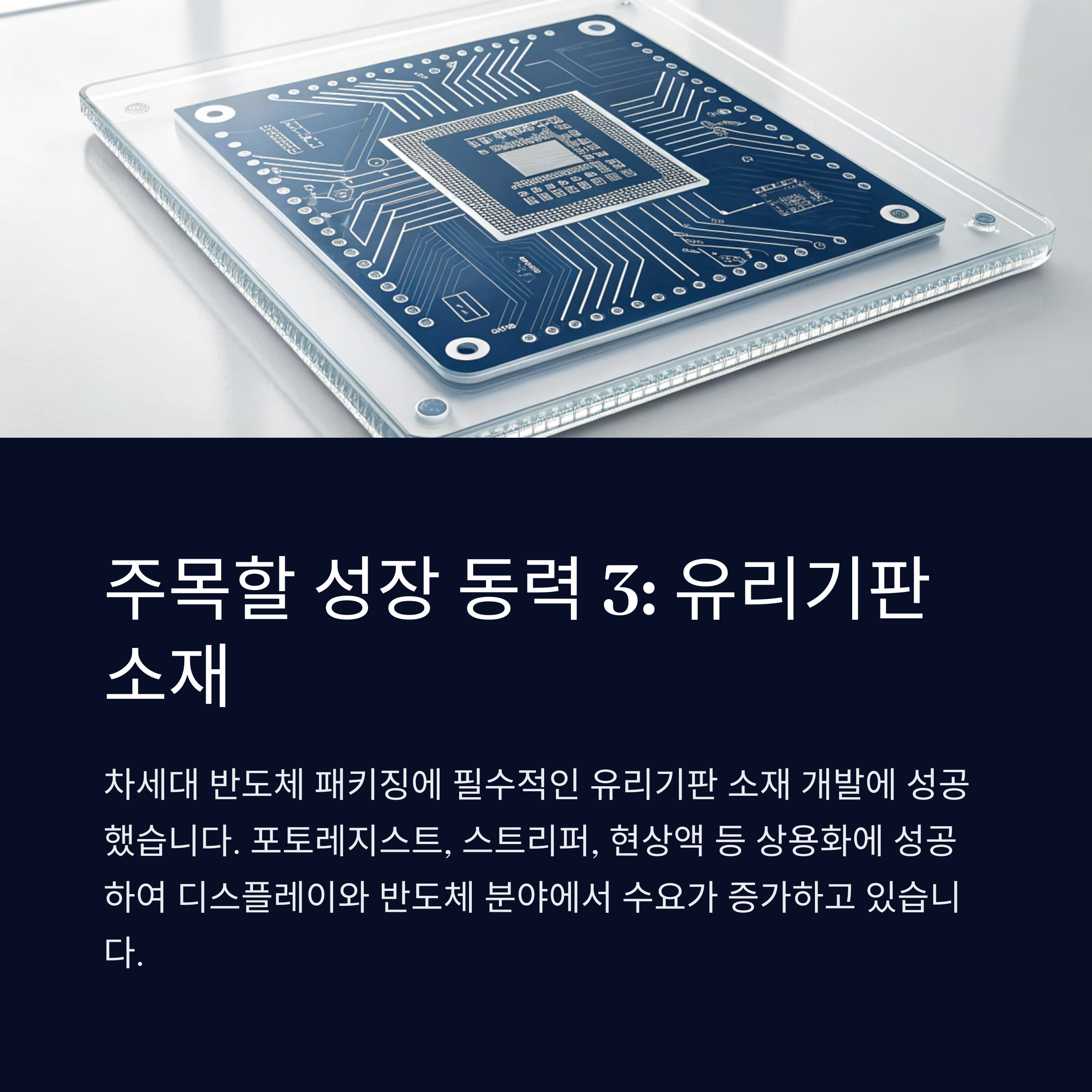 뿐만 아니라, 유리기판 소재 부문에서도 경쟁력을 갖추고 있습니다. 기존의 플라스틱 기판보다 물성이 뛰어난 유리기판은 차세대 반도체 패키징에 있어 필수적인 요소입니다. 와이씨켐은 유리기판에 필요한 포토레지스트, 스트리퍼, 현상액 등의 소재를 개발해 상용화에 성공했으며, 디스플레이와 반도체 분야 양쪽에서 수요가 증가하고 있습니다.