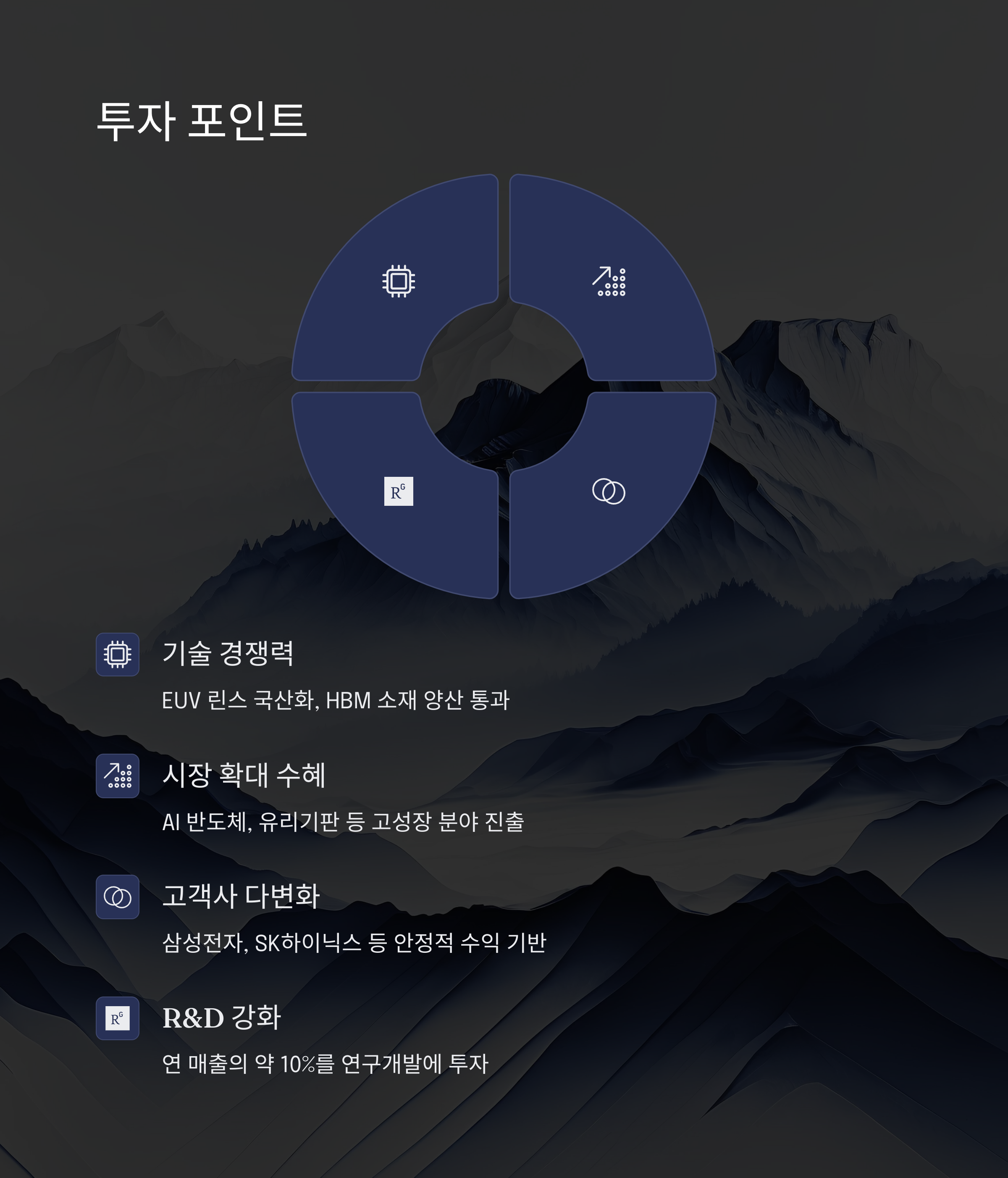- 고객사 다변화: 삼성전자, SK하이닉스 등 국내외 주요 기업과 협력하며 안정적 수익 기반을 확보하고 있습니다.