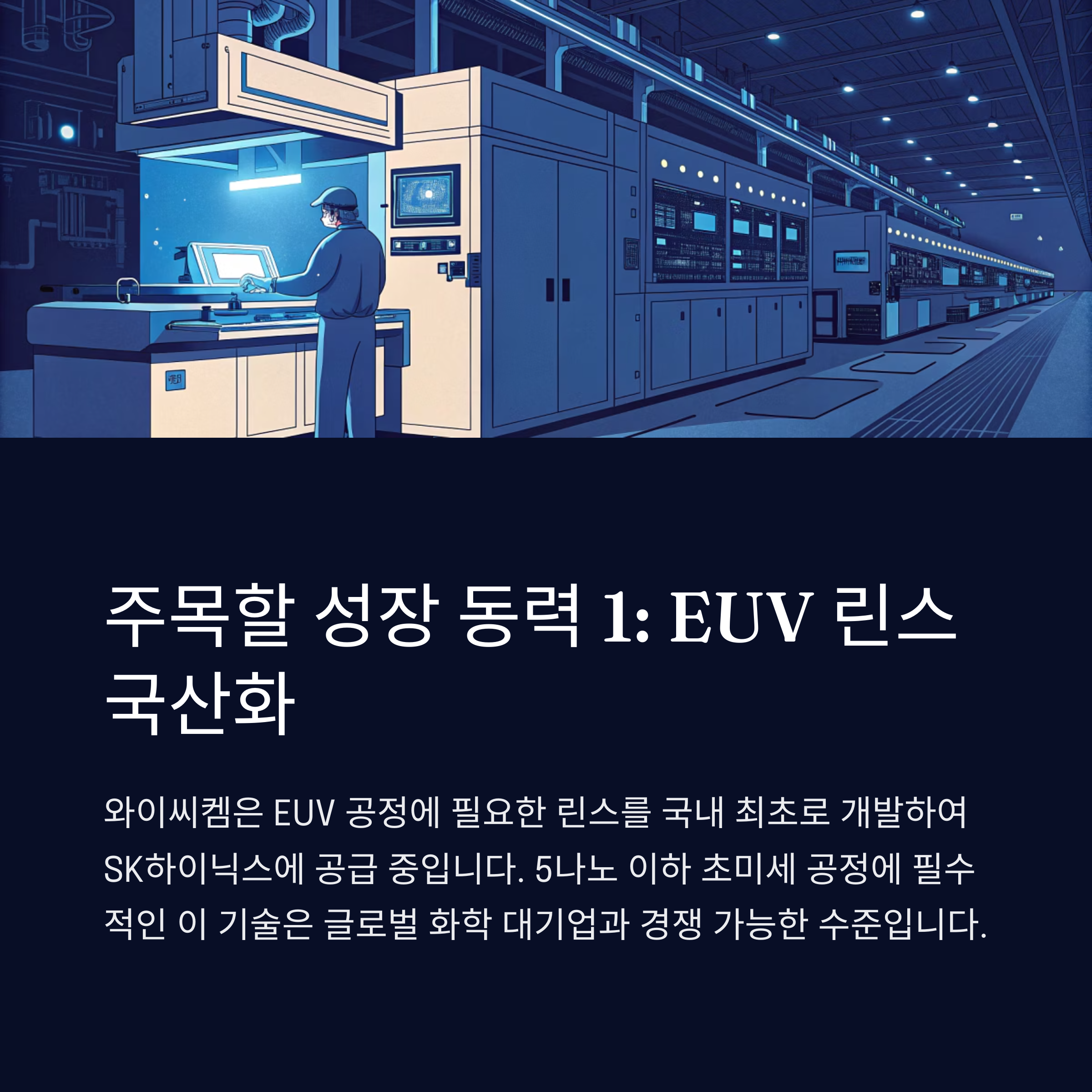 가장 주목해야 할 성장 모멘텀은 바로 EUV 린스 국산화입니다. 와이씨켐은 EUV 공정에 필요한 린스를 국내 최초로 개발했으며, 이를 SK하이닉스에 공급하기 시작했습니다. EUV는 5나노 이하의 초미세 공정에서 반드시 필요한 기술이며, 이에 쓰이는 소재는 대부분 해외에서 수입되고 있었습니다. 와이씨켐의 기술력은 독일 머크나 바스프와 같은 글로벌 화학 대기업과 경쟁 가능한 수준으로 평가됩니다.