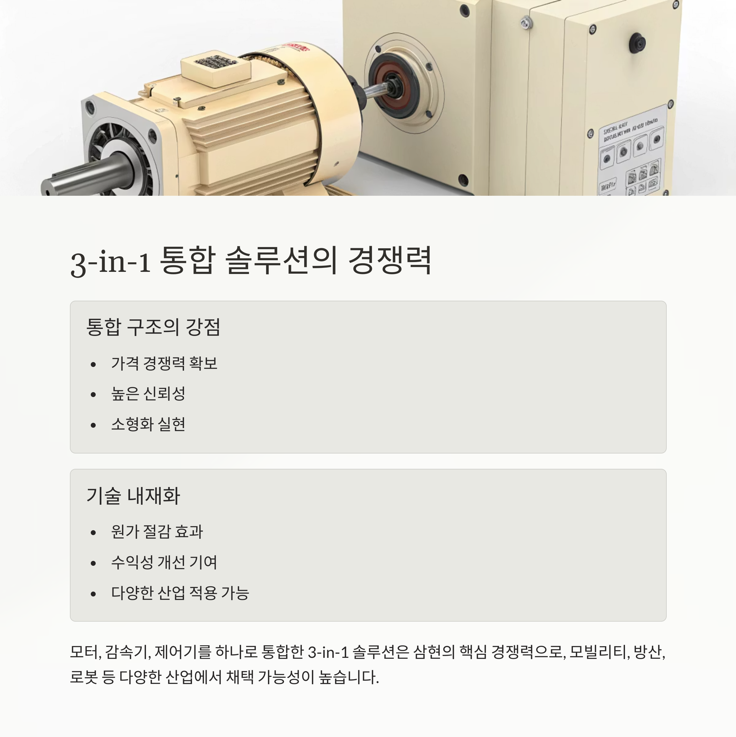 삼현의 가장 큰 강점은 모터, 감속기, 제어기를 하나로 통합한 3-in-1 솔루션입니다.
