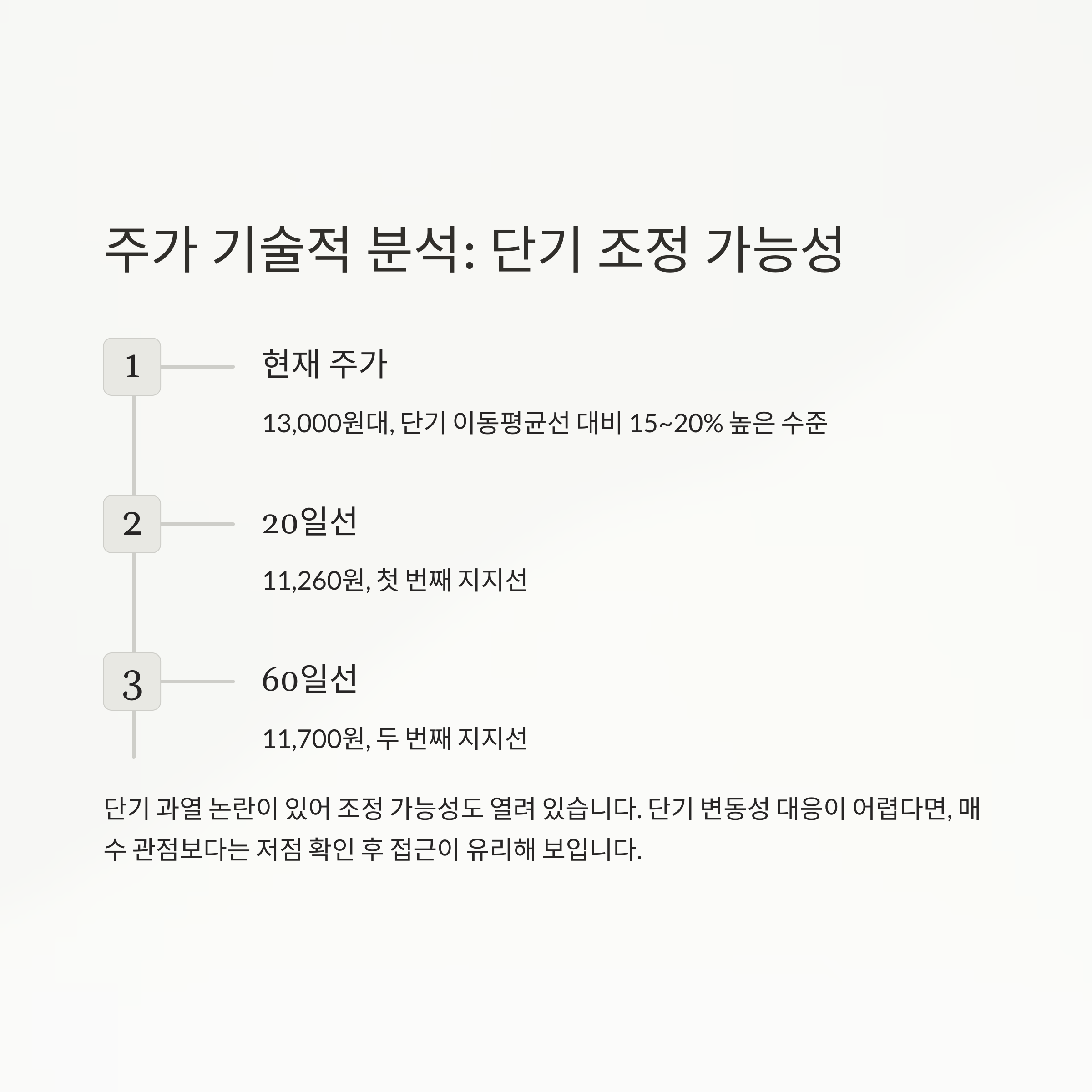 단기 조정 가능성도 열려 있는 만큼, 20일선(11,260원), 60일선(11,700원) 지지력 확인이 중요합니다.